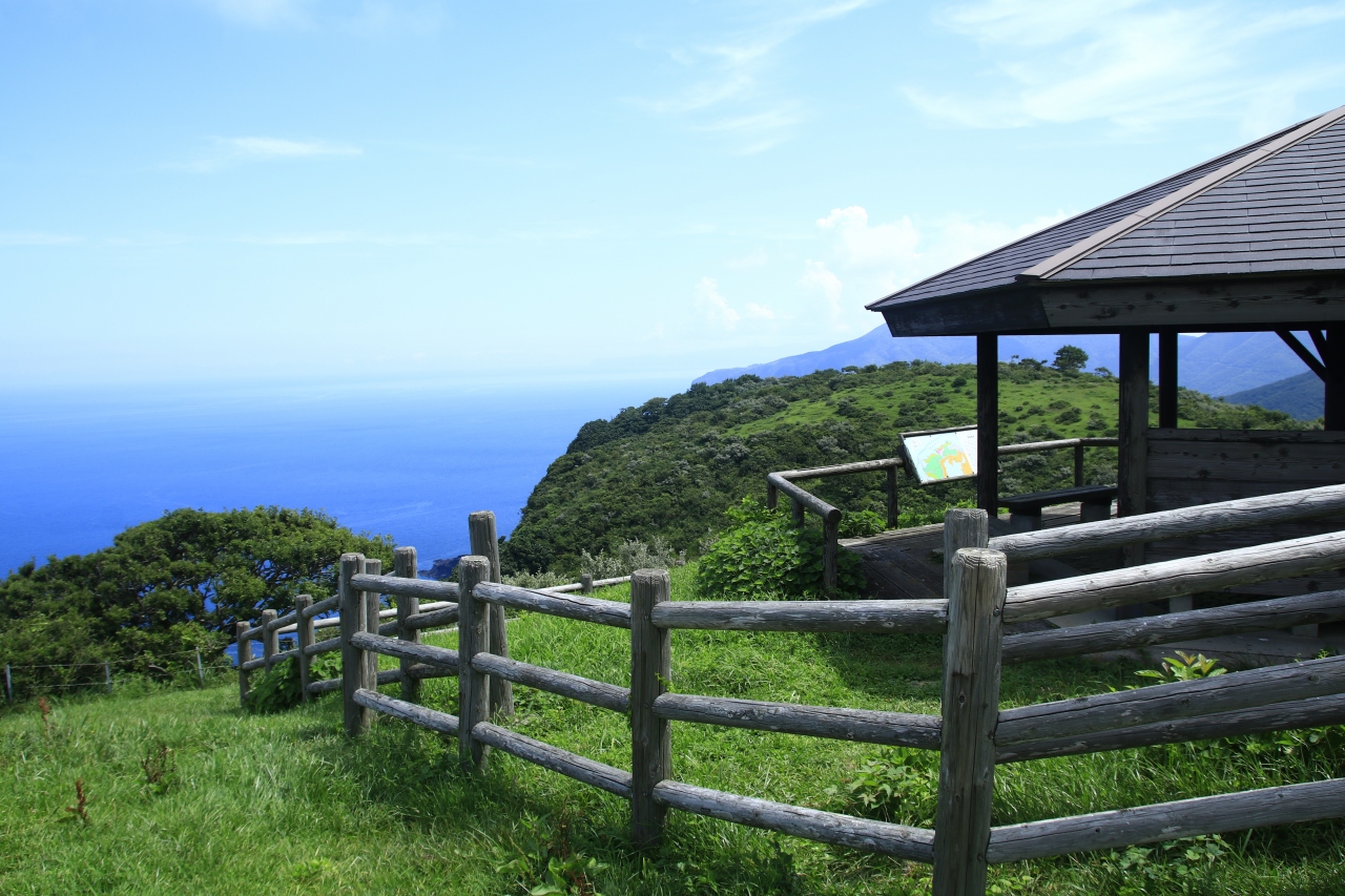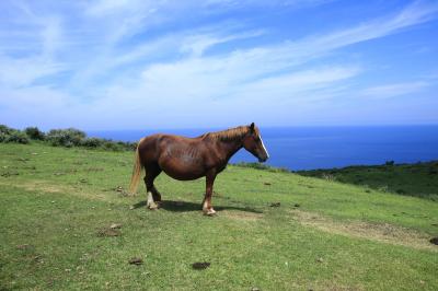 隠岐諸島の観光パンフレットによくある、崖の上の草地を牛や馬がのどかに放牧されている光景はこのあたりで見ることができます。