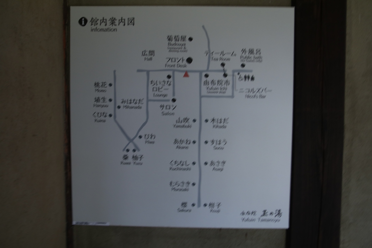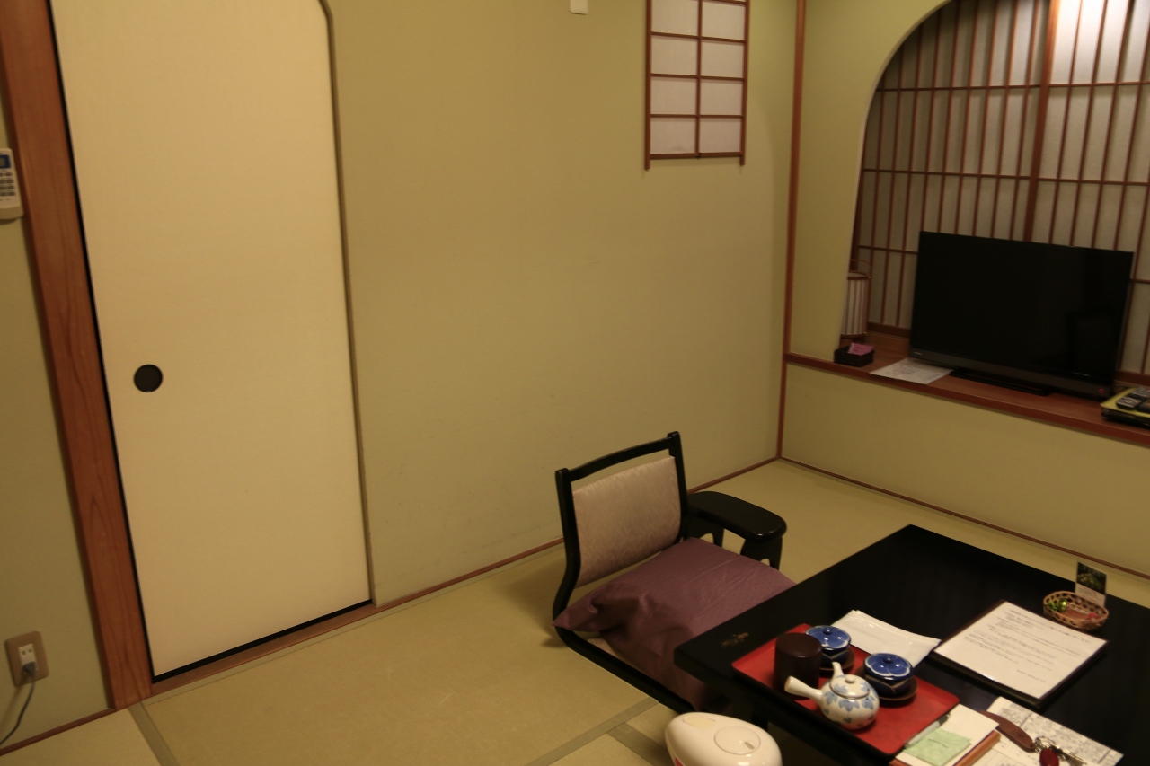 1日目の内風呂付8畳の部屋は、宿の中ほどにあり、窓もなく暗い感じの部屋で、温泉風呂付というプレミアがなければ、ランク的にはかなり低い感じです。