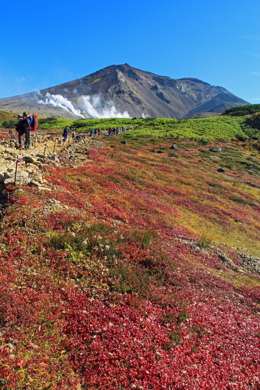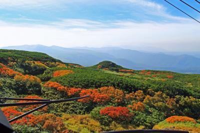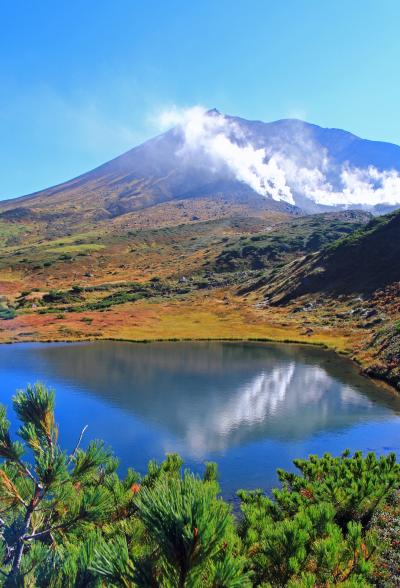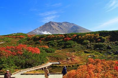 ロープウェイの姿見駅から遊歩道を周遊。秋晴れの中、点々と色ずく赤や黄・オレンジの紅葉。そして姿見の池と青空に上がる白い噴煙。