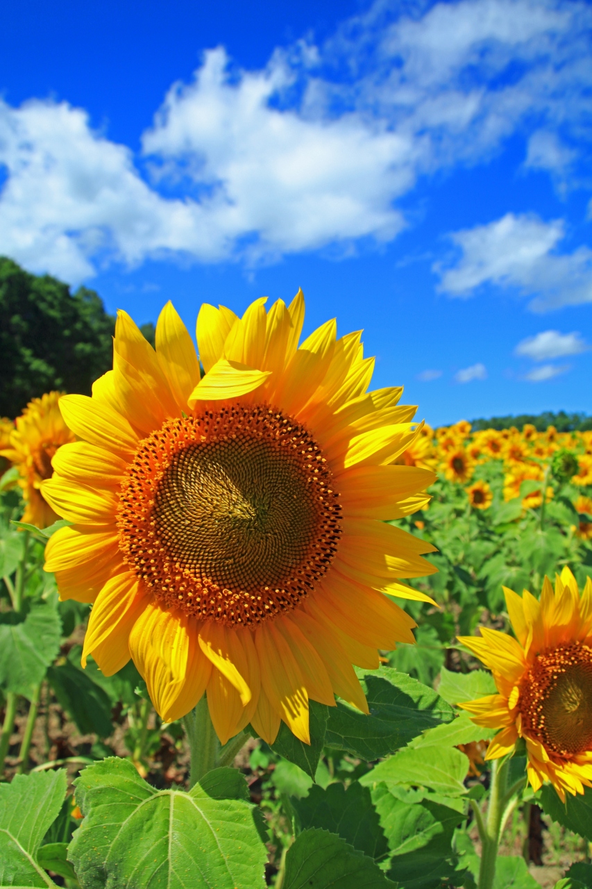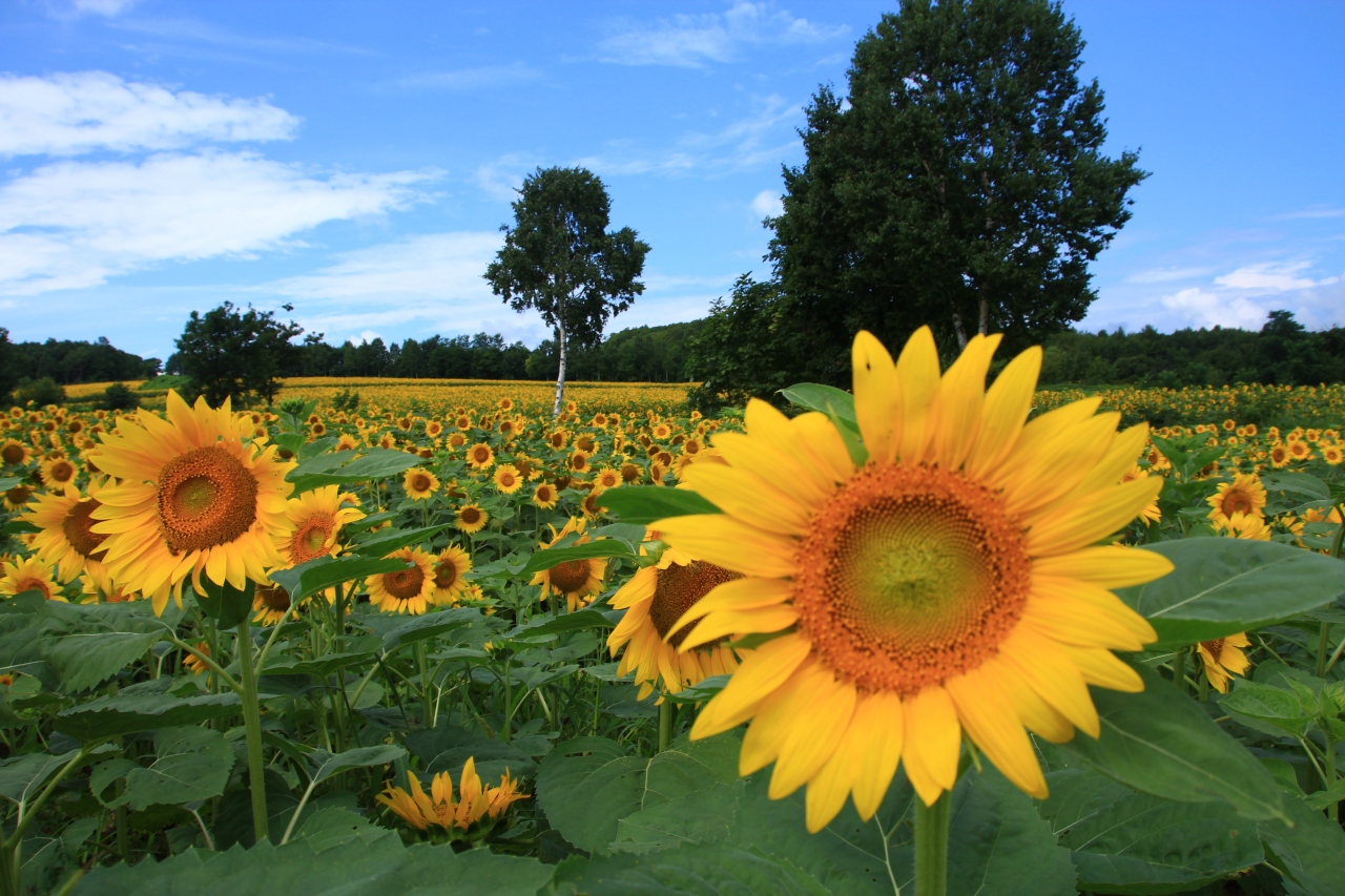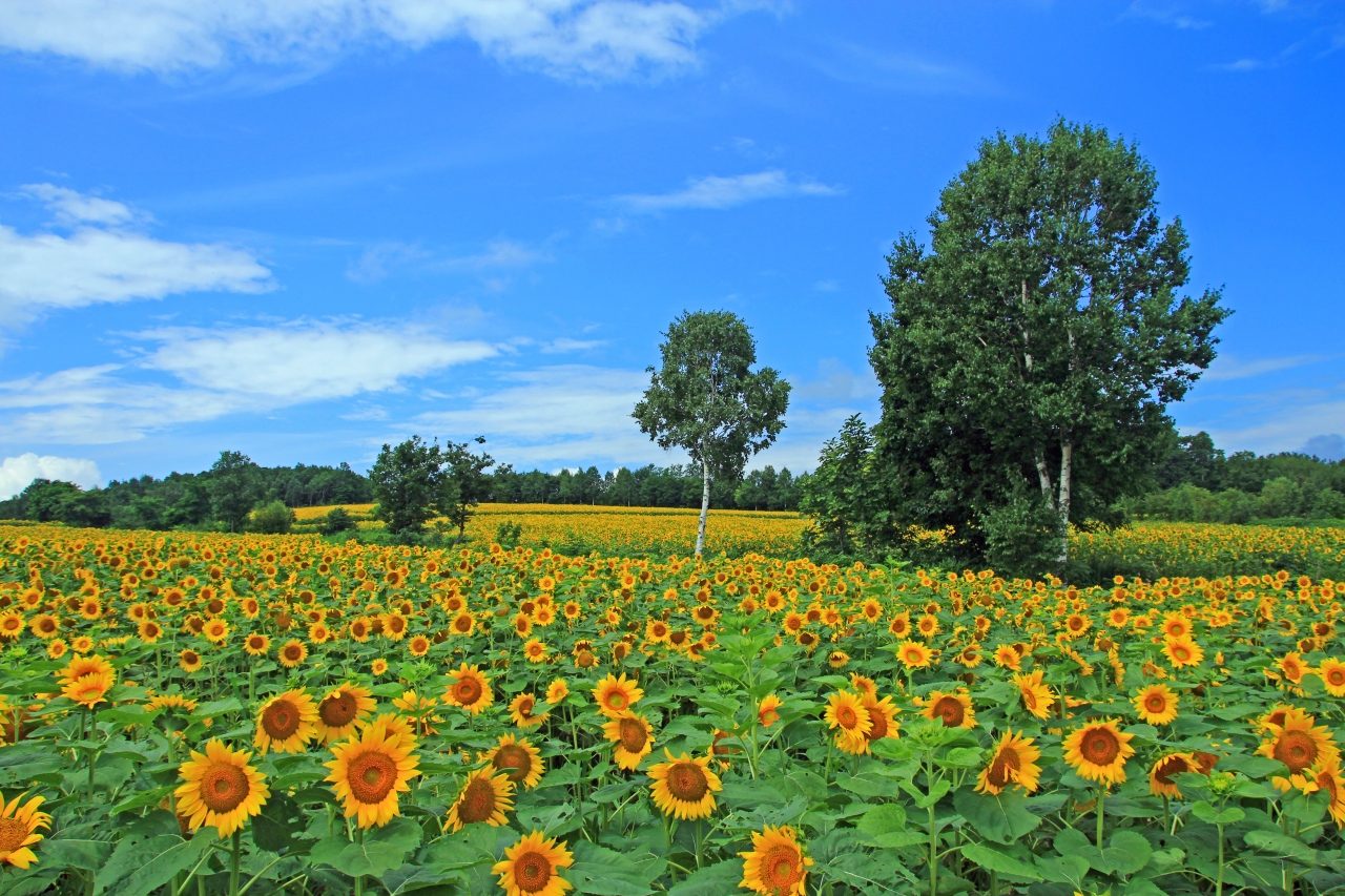 青空の下、黄色のひまわりと北海道らしい白樺の木。とにかくお勧めです。