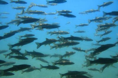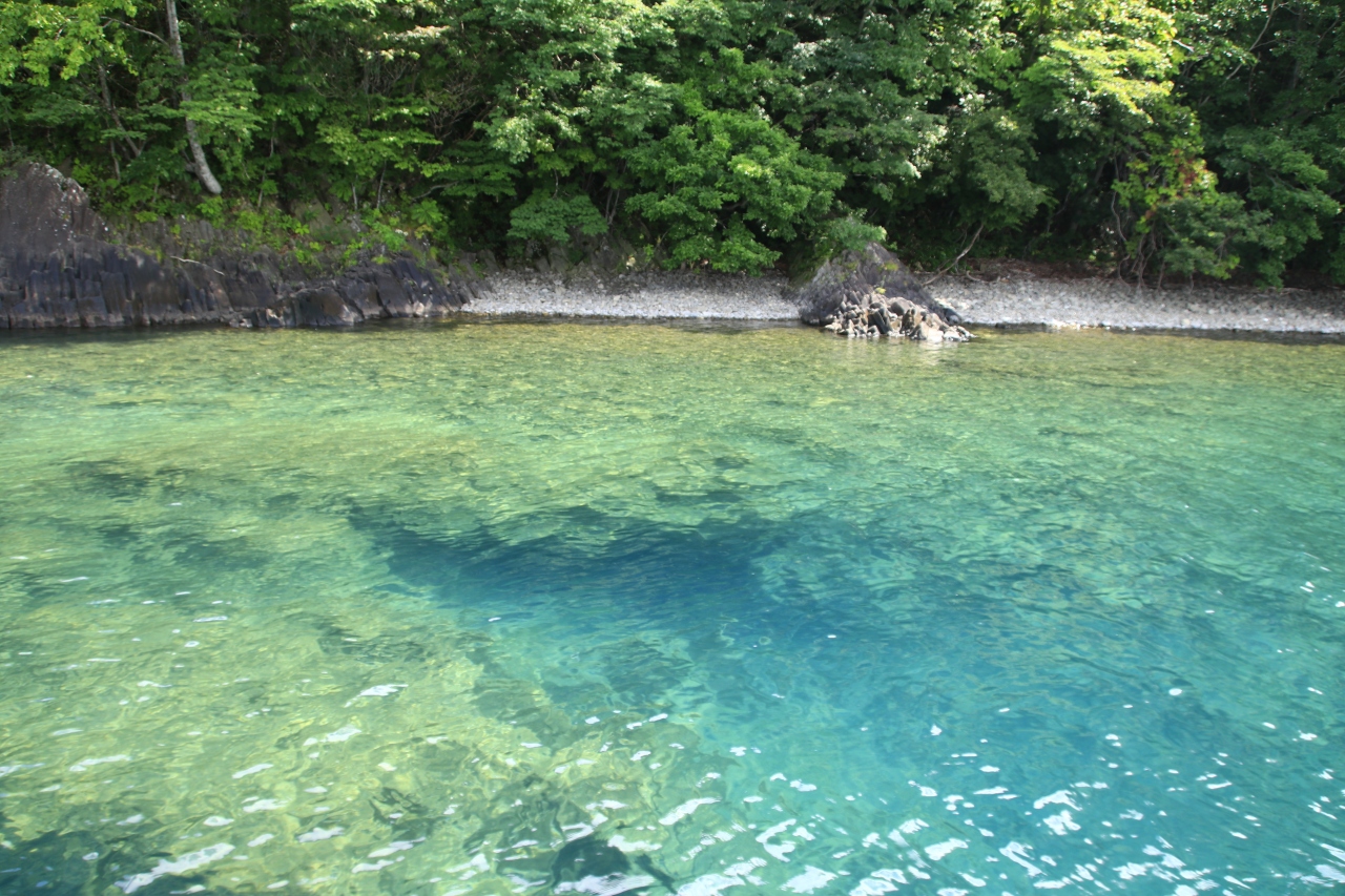 湖底が見える観光遊覧船に乗って周遊しましたが、数多くのヒメマスのほか、透明な湖底には過去の噴火の際の溶岩が固まってできた柱状節理がきれいに見えました。この柱状節理は層雲峡や知床半島などでも見ることができます。