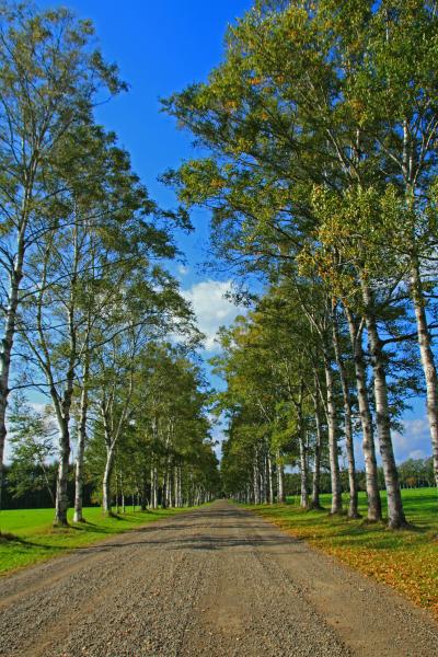 緑の野原と牧場の中、白樺並木が続く北海道らしい光景が見られる場所です。なんか札幌近郊の光景のようかと思いましたが、十勝の公営牧場の入り口付近にあります。