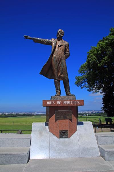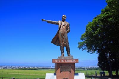 青空の下、緑の牧草地をバックに「Boys be ambitious」の文字を掲げた銅像が非常に映えます。