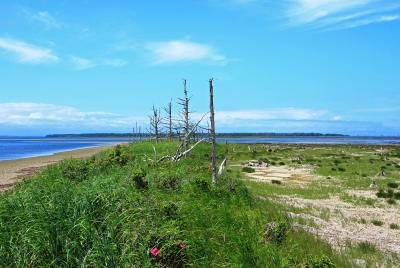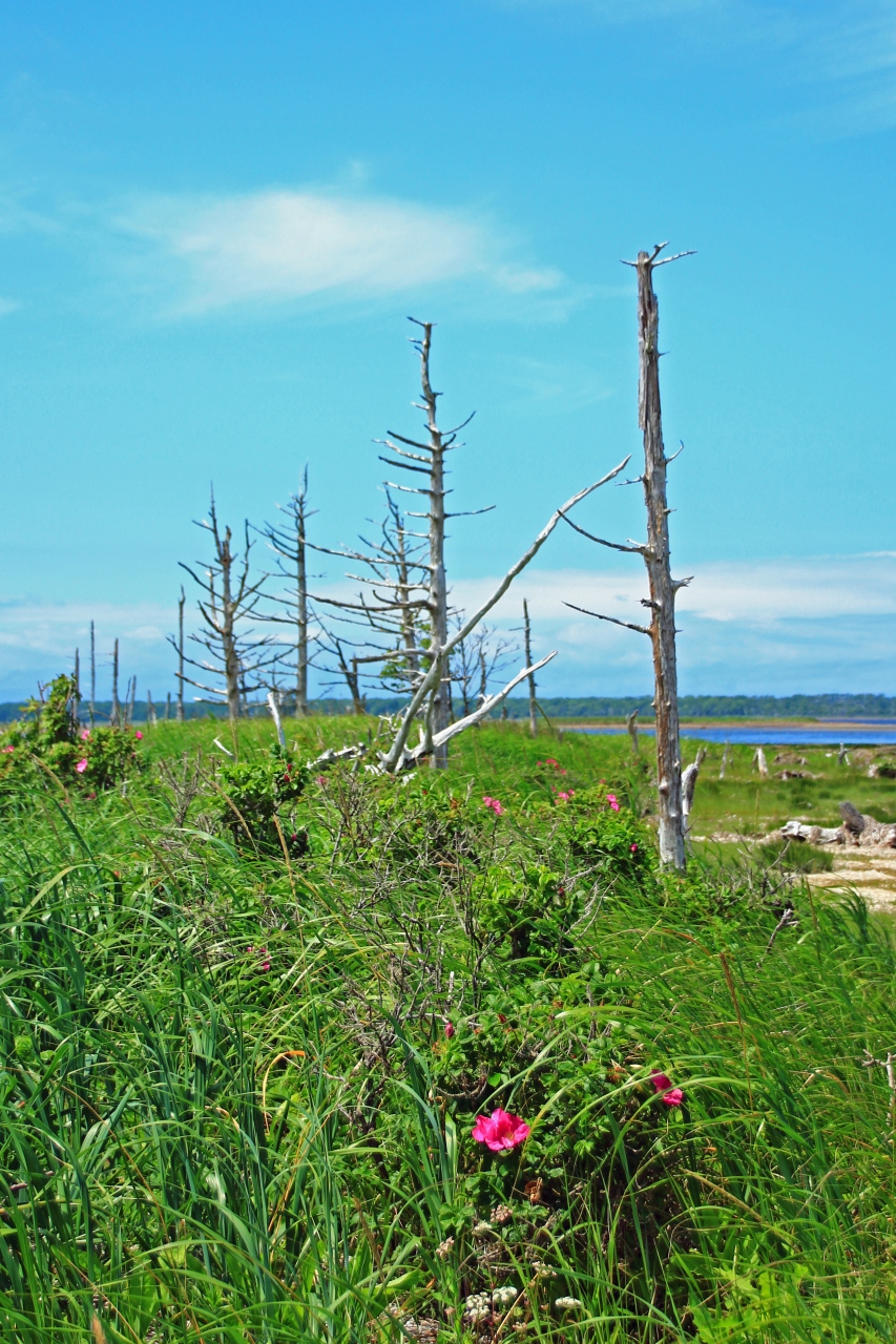 こちらは昔から有名な観光地で、かつて陸であったところが沈下により海水をかぶって、その際にトド松、カラマツが立ち枯れた景色が続きます。ただ、単なる寂寥とした感じではなくて、根元には緑が戻っており、ハマナスの花の群生も見られるなど、不思議な光景を見ることができます。