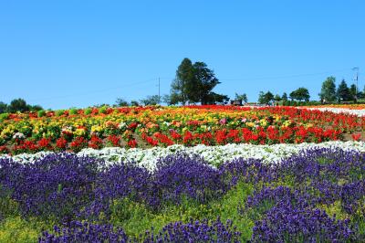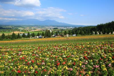 上富良野の丘の上にあるため、国道からは少し離れていますが、高台になった丘からは、付近のアップダウンを繰り返す丘陵地や、遠く大雪山連邦まで見え、色とりどりの花がその前に咲いているという絶好のシチュエーションでした。
