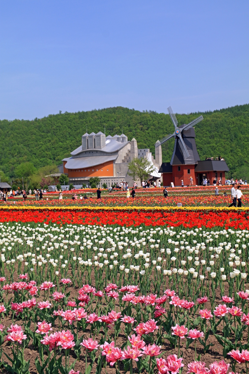 TVで事前に見た通りでしたが、園内は広く、オランダに模した風車や結婚式場の建物などがチューリップ畑の間に見え、絶景です。