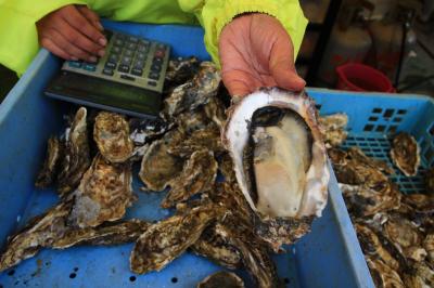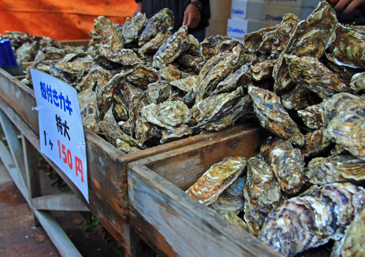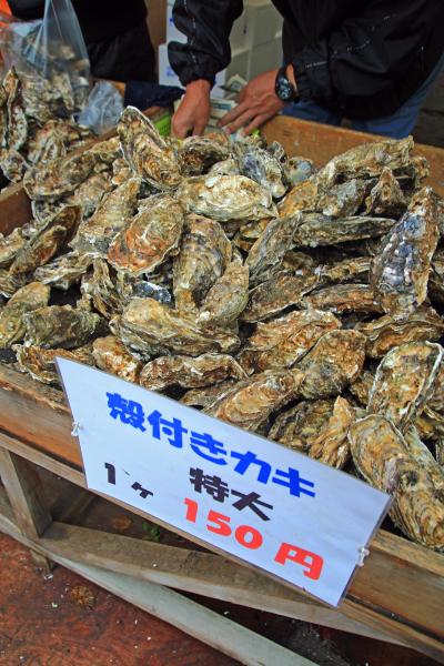 もちろん両方見てみましたが、公園のほうは出店があり、みな七輪やバーベキューセットを持ってきて、生のまま買ったカキを焼いて食べます。といっても、この日はあいにくに雨で、途中からバーベキューどころではなくなり、市場のほうへ移動しました。