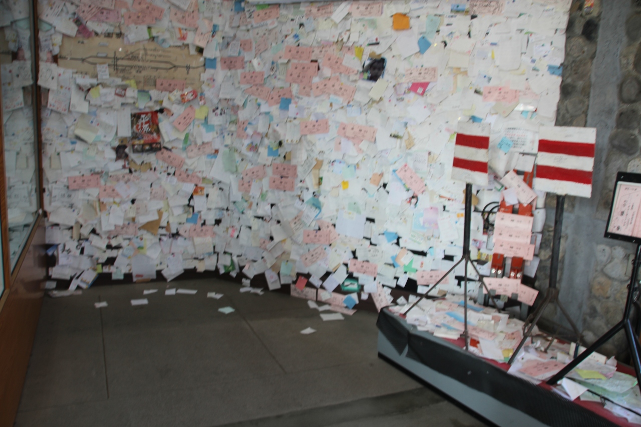 旧駅舎は再建されたもののようですが、中にはびっしりと切符(もちろん駅前で売っている観光用)が張られ、思い思いのメッセージが書かれています。