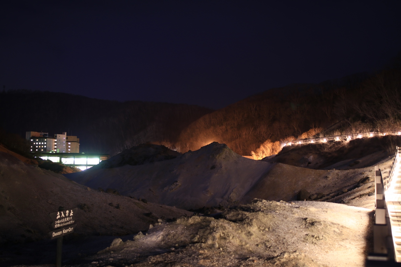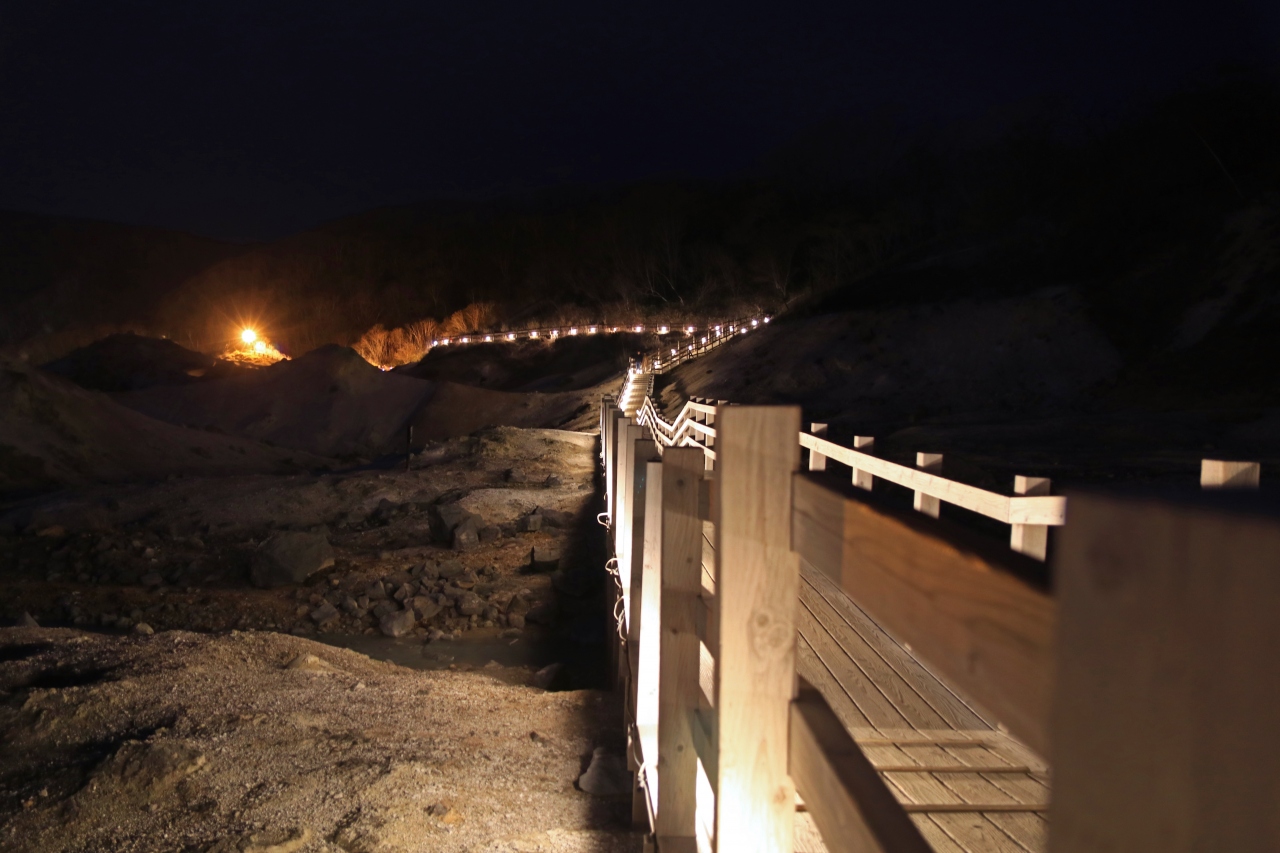 登別で夜の地獄谷をライトアップし、名前を鬼火の道として観光スポットにしています。