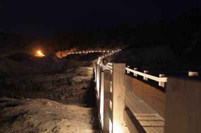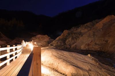 地獄谷自体が無料なので、いつでも行けますが、ライトアップといってもその遊歩道を照らしているのみですので、暗くなってしまうと周囲はあまり見えません。地獄谷の面白さは噴煙とか硫黄岩なので、道だけでなく周囲もライトアップしたらよいと思いました。
