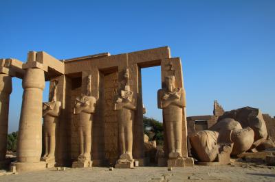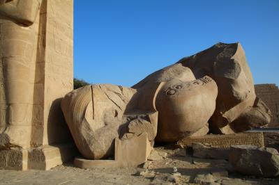 ラムセス2世というと、エジプト新王国時代でも最大の権力を誇ったファラオで、アブシンベル神殿をはじめ、エジプト各地に神殿を建立し、自分の石像を残しました。その偉大なファラオの葬祭殿ですので、さぞかし壮大なものかと思いますが、現在はほとんどが倒壊しており、塔門と一部の石像が残るのみです。