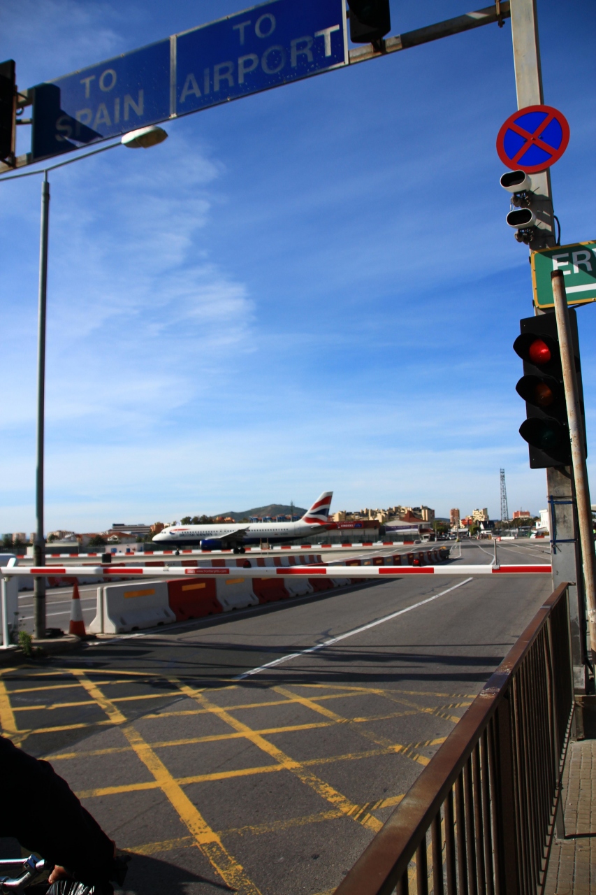 ジブラルダルはイギリス領の飛び地ですが、領地は狭いため、ジブラルダル半島からスペイン領にわたる途中に飛行場が設置されています。