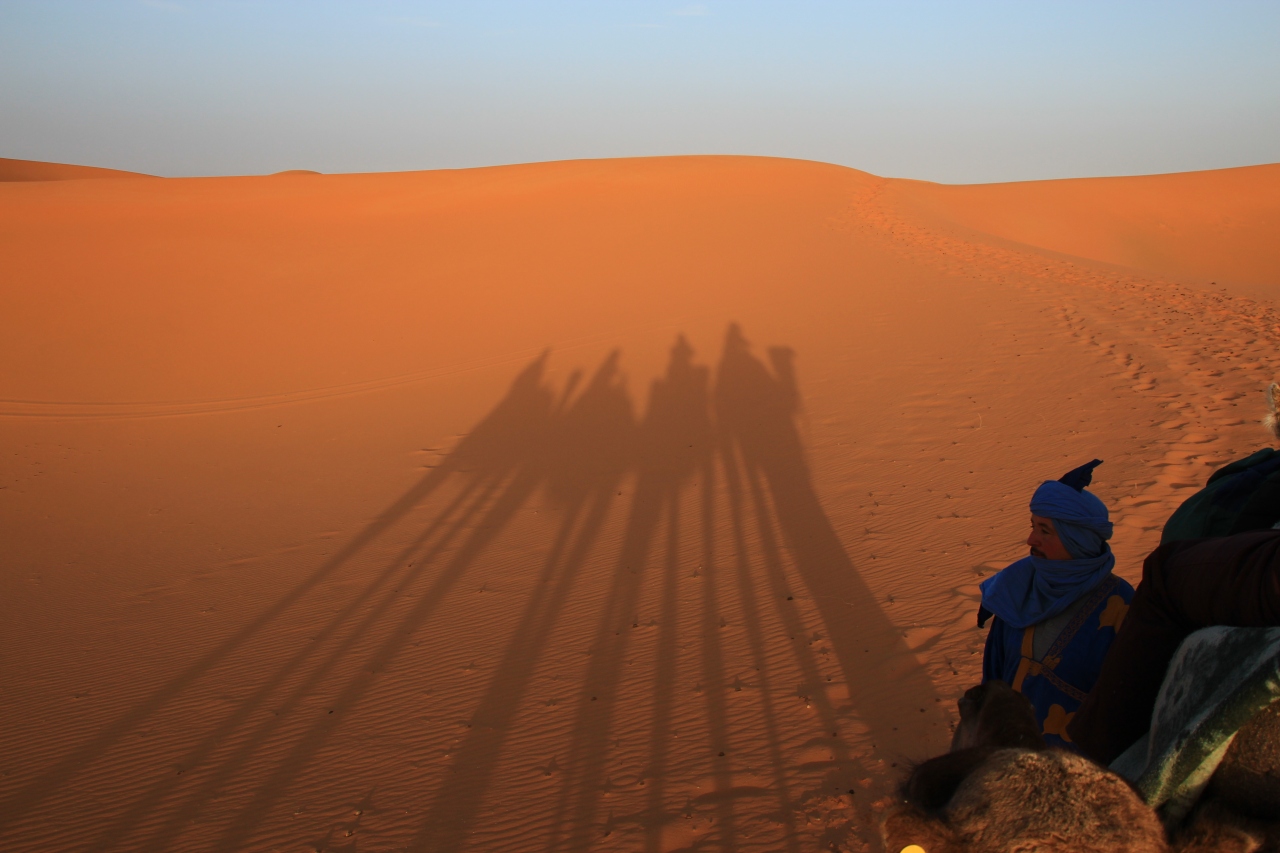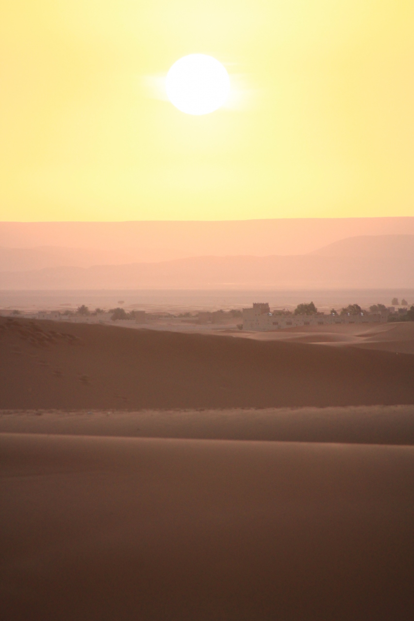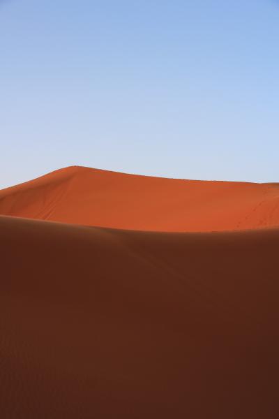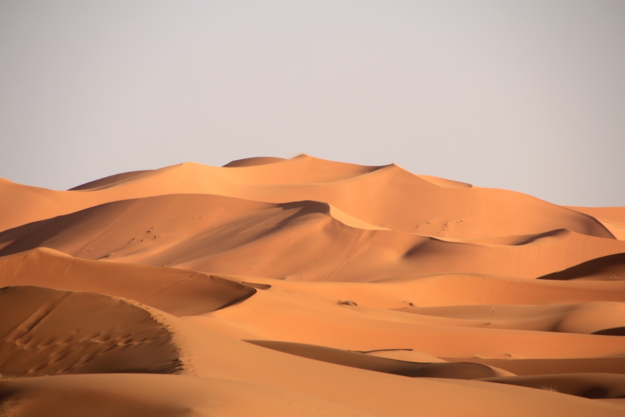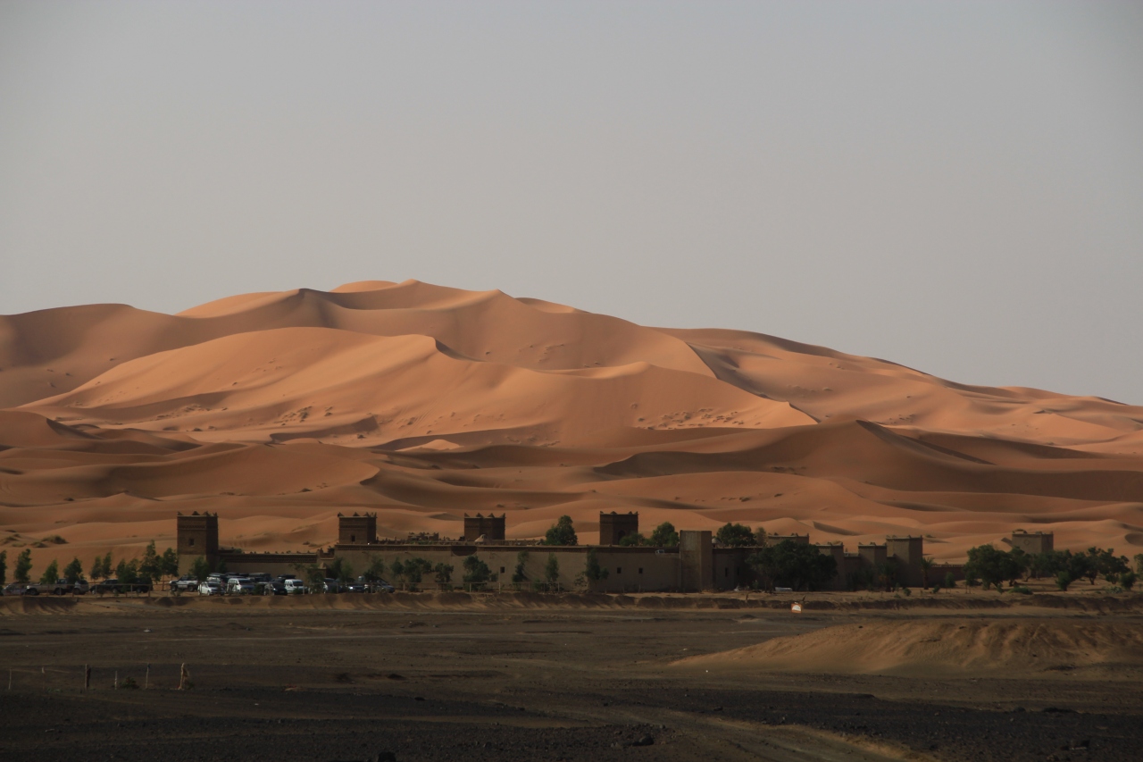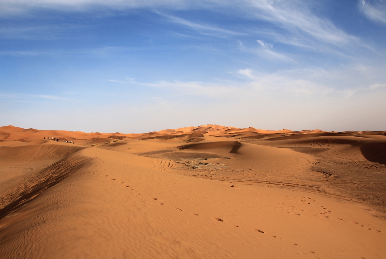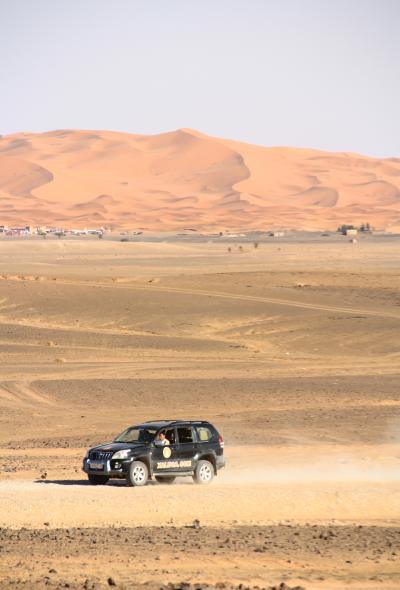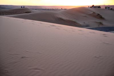 一番近くの大きな町、エルフードから4WDに乗り換えて1時間、大砂丘が見えてくるといよいよ来たんだなという気持ちになります。なお、サハラ砂漠自体はその周囲の礫砂漠のほうがはるかに広く、日本人がイメージする赤色の砂丘というのは砂漠の一部分でしかありません。とはいえ、それでも非常に大きく、各砂丘の頂点は数百メートルまでありますので、その姿は丘というより山といっても良いくらいの規模です。