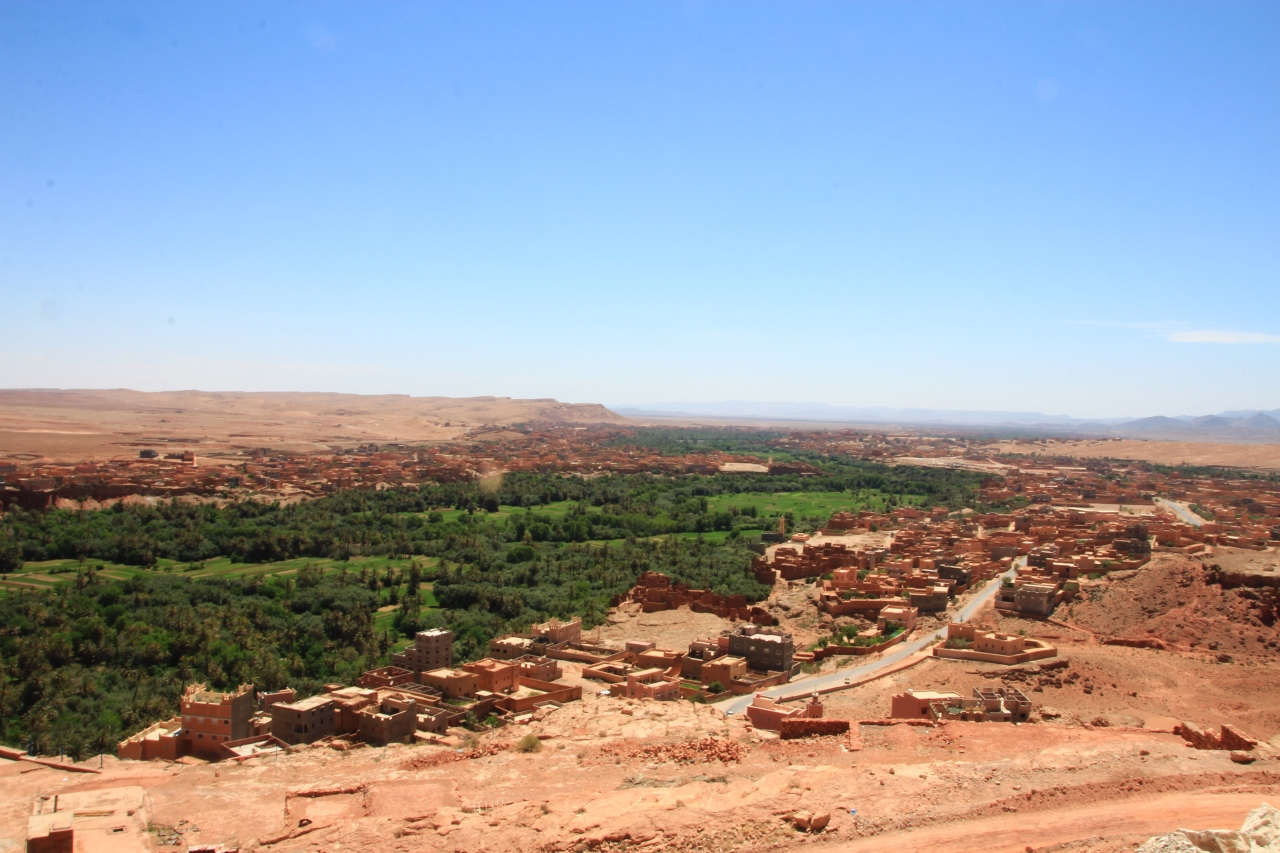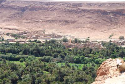 フェズ方面からアトラス越えをしてサハラ砂漠(メルズーガ)の方向に向かう道の周辺は礫砂漠と言っていい荒寥とした大地が続きますが、渓谷に沿って椰子の木が繁茂するオアシスが所々に見えてきます。これがズィズ川の周囲に開けたズィズ渓谷で、川の流れに沿って緑のベルト地帯が続きますので、高台から眺めた景色は絶景です。