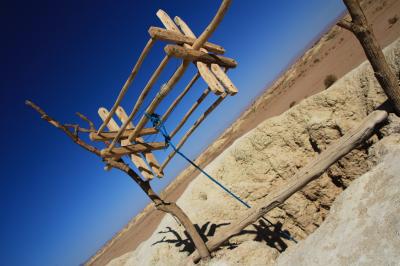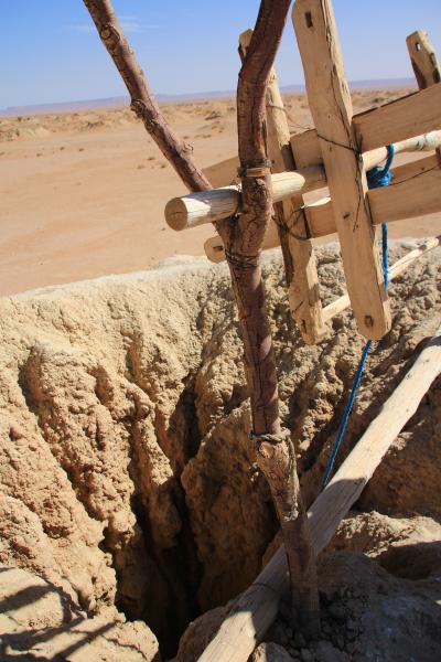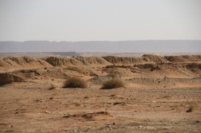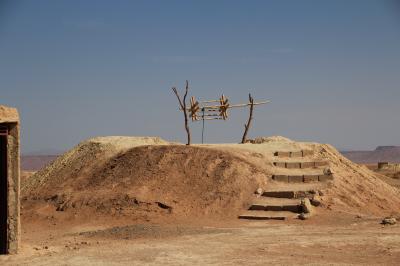 すると、掘立小屋のような店の中からガイド(店主?)が出てきて、付近の光景について一通り説明してくれました。最初、その塚のようなものは砂漠地帯の井戸かと思いましたが、これは遠くから水を運んできていた運河で、この一帯に定住する住民やノーマッドに貴重な水を供給する役割を果たしていたということです。(ノーマッドとはこの地方の言葉で、家を持たず、羊や牛を追いながらオアシスや水源地を渡り歩く遊牧民をさすようです。)