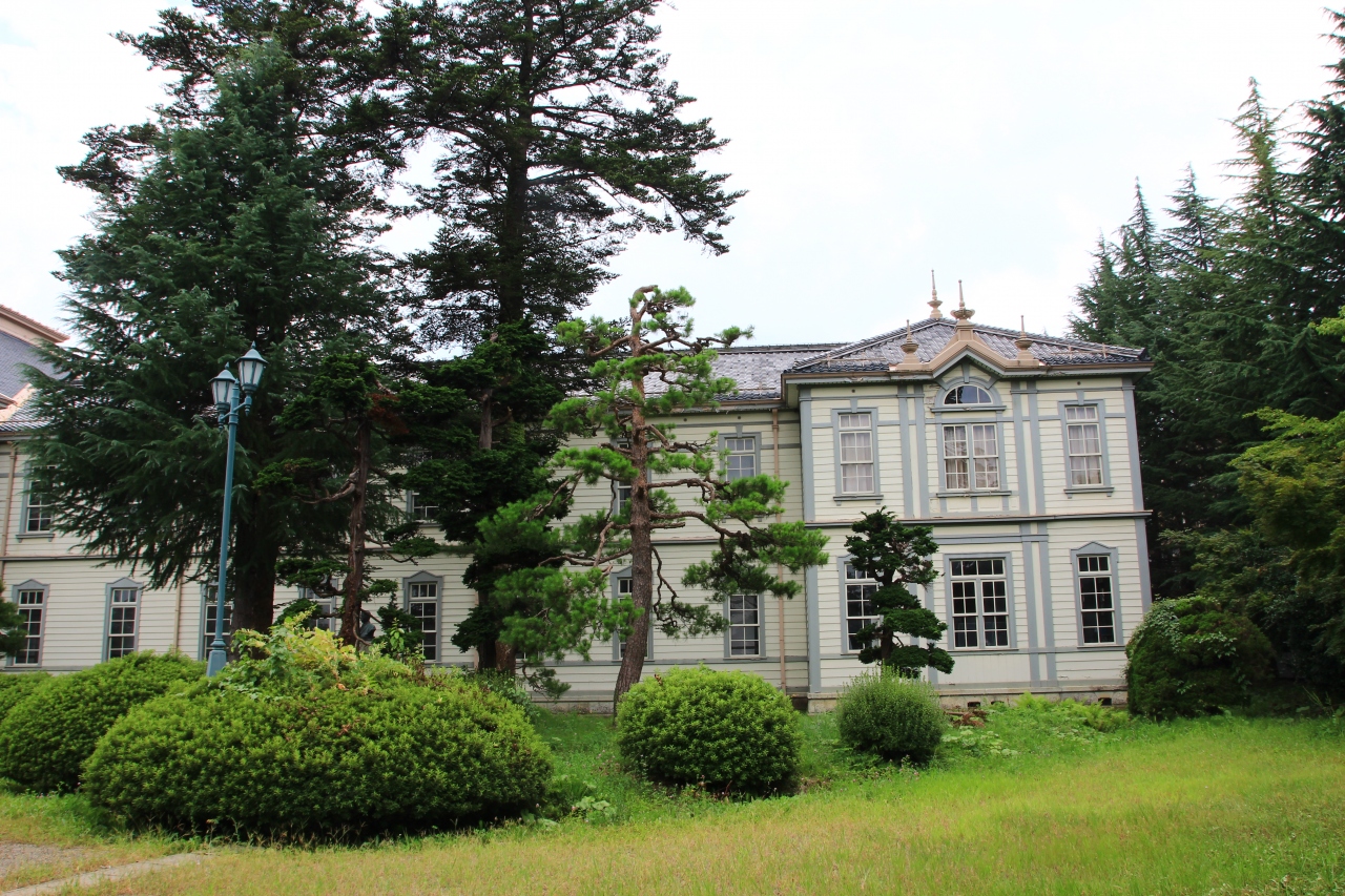 米沢市内には歩いているといろいろな歴史ある建物に出会いますが、こちらも大正モダン風の美しい木造建築が目をひきます。市街の中心からは若干離れていますが、米沢城跡からは徒歩で30分くらいで、これまた観光目的となることの多い春日山林泉寺のすぐ隣ですので、ついでに立ち寄ることは十分可能です。