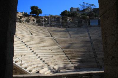アクロポリスの丘のふもとにある紀元前に建てられた劇場の跡です。こちらは1万人以上が収容できる施設であったようですが、今は見事に廃墟となっており、座席となっていた石段も下部に少ししか残っていません。アクロポリスの丘からは、柱廊を挟んでイロド・アティオコス音楽堂も見え、こちらはきれいに復旧されて、現在も音楽祭等に使われますので見事な対比をなしています。