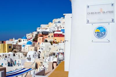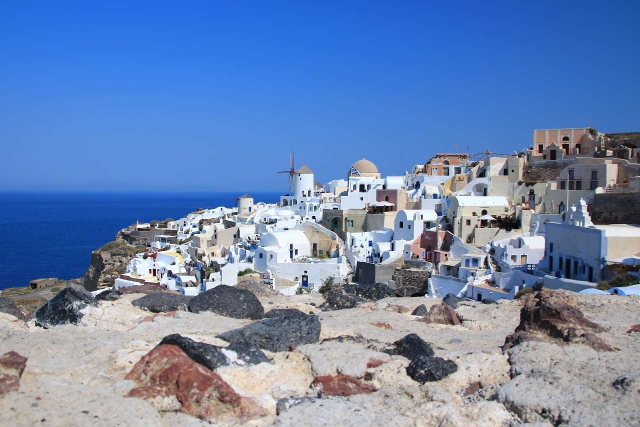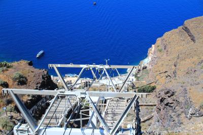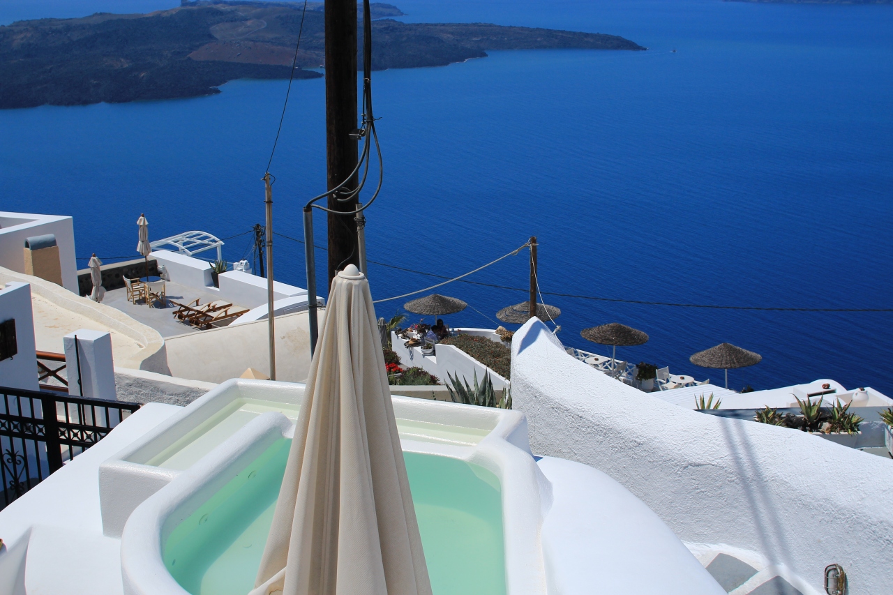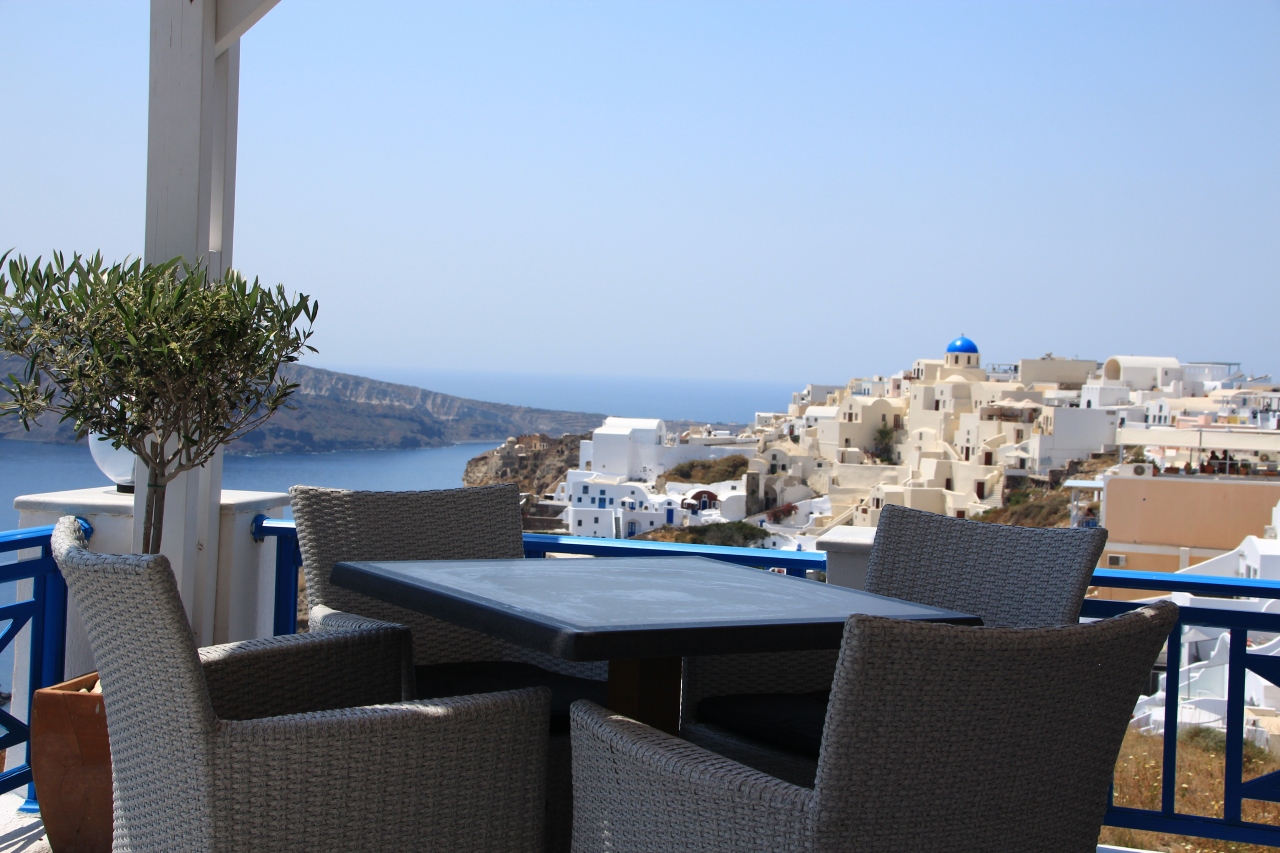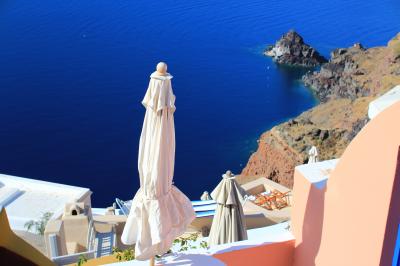 眺望は新市街の側にありますので、白一色の豪華なヴィラホテルの眺めが中心ですが、眼下には青いカルデラが広がり、非常に美しい景色を見ることができます。