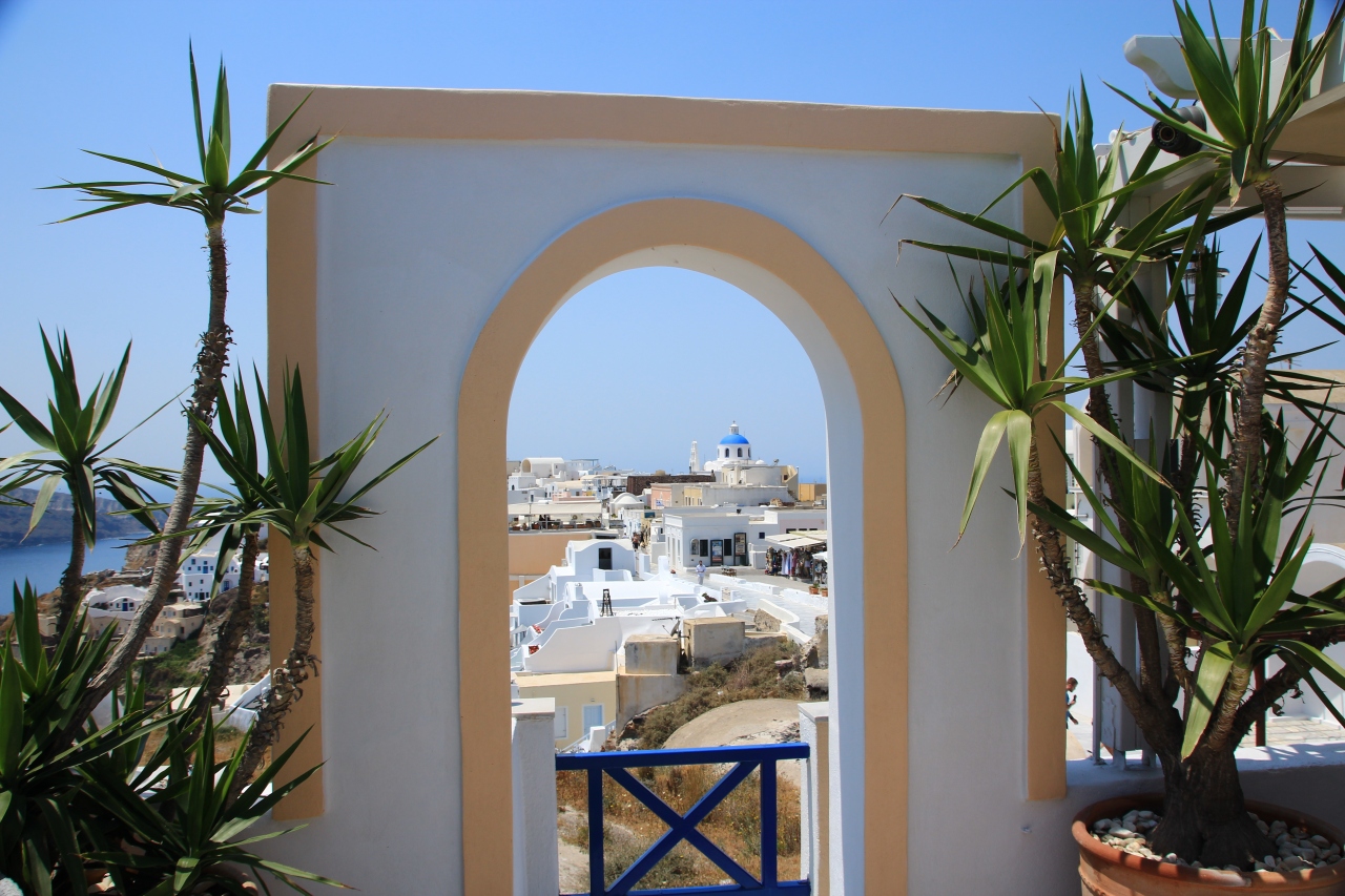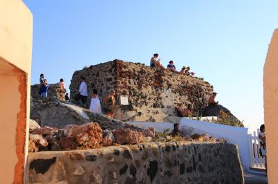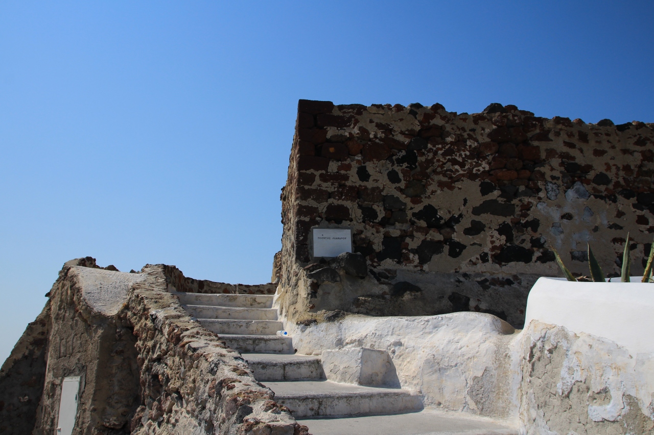で、行ってみてですが、場所に驚きです。よくサントリーニ島の絵葉書や紹介で使われる写真に青い屋根の教会の横のオレンジ色の壁の場所から撮影している写真がありますが、そのオレンジ色の壁がこの施設の壁です。また、海を見下ろすピンク色の鐘のある教会の場所もここからすぐ上にあたります。まさにサントリーニ島の景色の一番美しい中心地です。