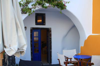 サントリーニ島の宿泊場所は迷いましたが、何よりも青い屋根の教会が見える場所に泊まりたいということがありました。といっても全くわからず、ここで他のトラベラーさんたちに質問したところ、イア地区の旧市街(西側)方面で、具体的には「my blue」または、この「レナズハウス」あたりの場所であるということが分かりました。しかし「my blue」は満室で、「レナズハウス」は3部屋しかなく、高い部屋しか空いていませんでしたので、手が出ないかと思いましたが、2週間前に安価カテゴリーの部屋に空きができ、しかも直前なので35%Offということで、慌ててスーペリア・ルームを予約しました。