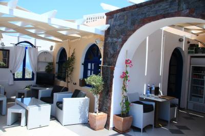 イアの町のバス停から海に面した通りに入ってきてすぐの場所にある2階建てのルーフトップレストランです。ちょうど新市街と旧市街の真ん中あたりにあり、場所的にはすごく便利な場所にあります。