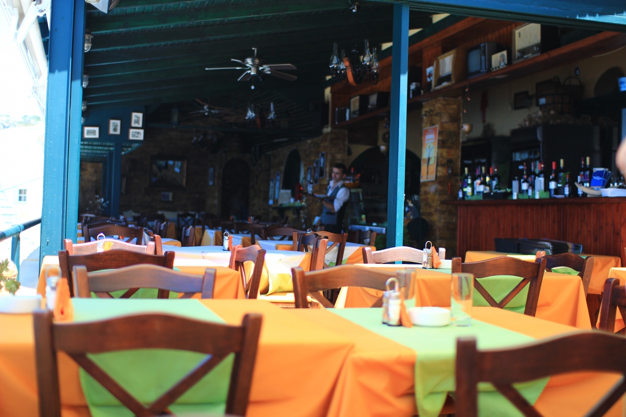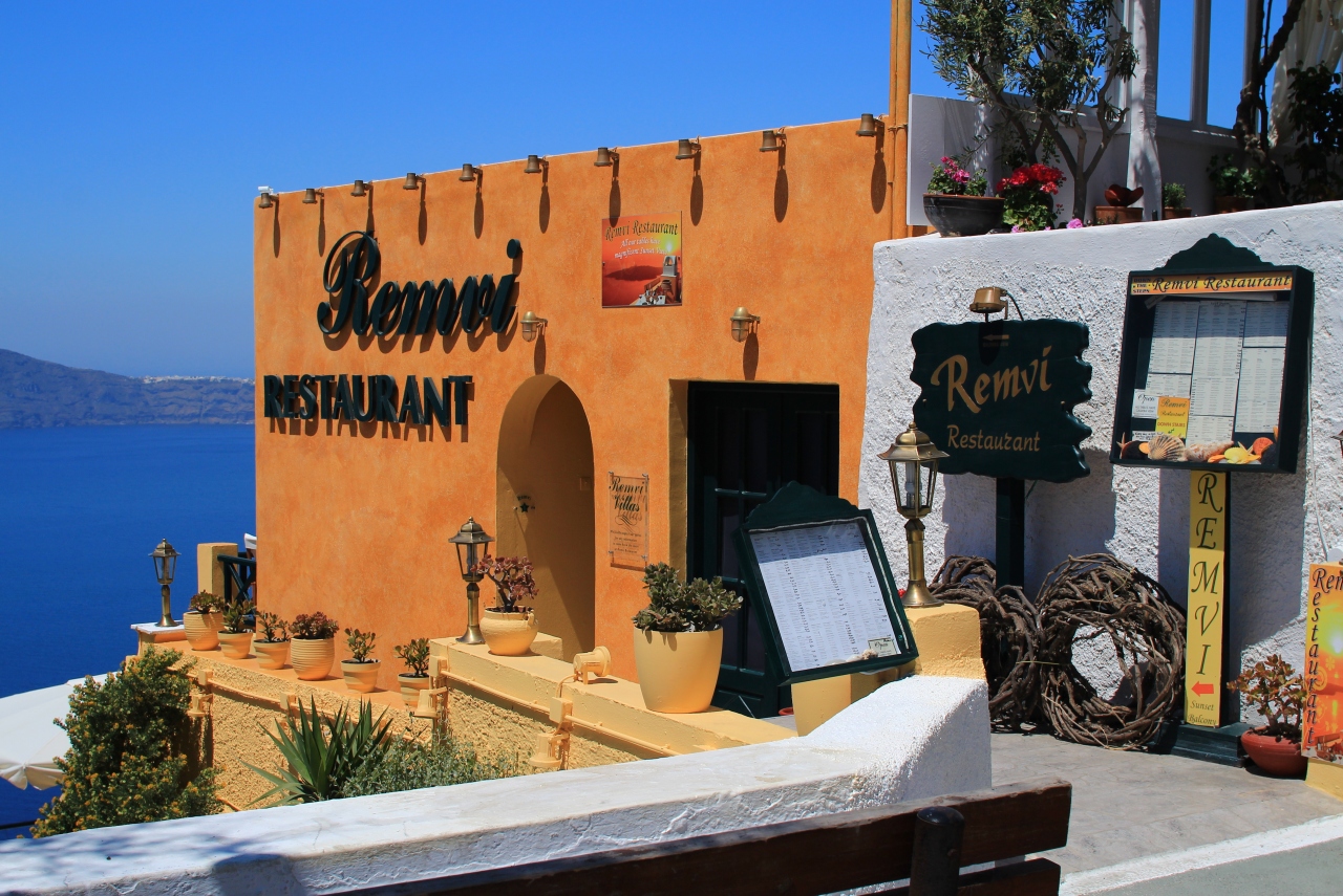 場所はフィロステファニのバス停から程近く、周囲には高級ヴィラが林立していますので、フィラの街中のように騒々しくなく、じっくりと食事をすることができます。