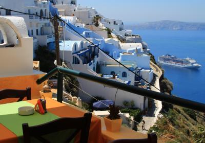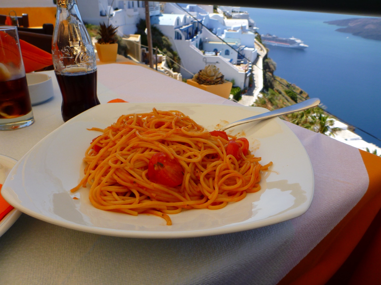 でも、目の前は見事なカルデラとクルーズ船。値段も飲み物を入れて18ユーロ(+2ユーロチップ)と高めでしたが、景色を食べていると思えば高いとも思いませんでした。