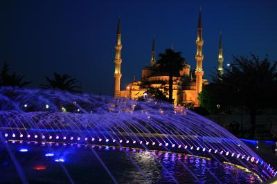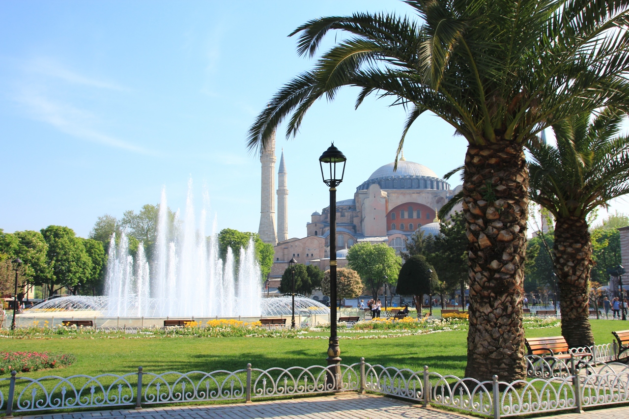 広場の中央には噴水があり、周りは花畑で囲まれていますが、その両側にはブルーモスク(スルタン・アフメット・ジャーミイ)とアヤソフィアの両方を見ることができます。全く違う二つの寺院の対比も面白いですし、噴水や花、椰子の木の彼方に見える両寺院も面白い光景です。また、夜になると寺院はもちろん、噴水もライトアップされ、昼とは全く違った美しさがあります。朝や夕にも刻々と変わりゆく景色は何度見ても良いものですので、ゆっくり芝生やベンチに座りながらの観光がお勧めです。- 旅行時期