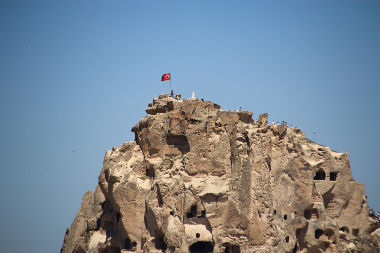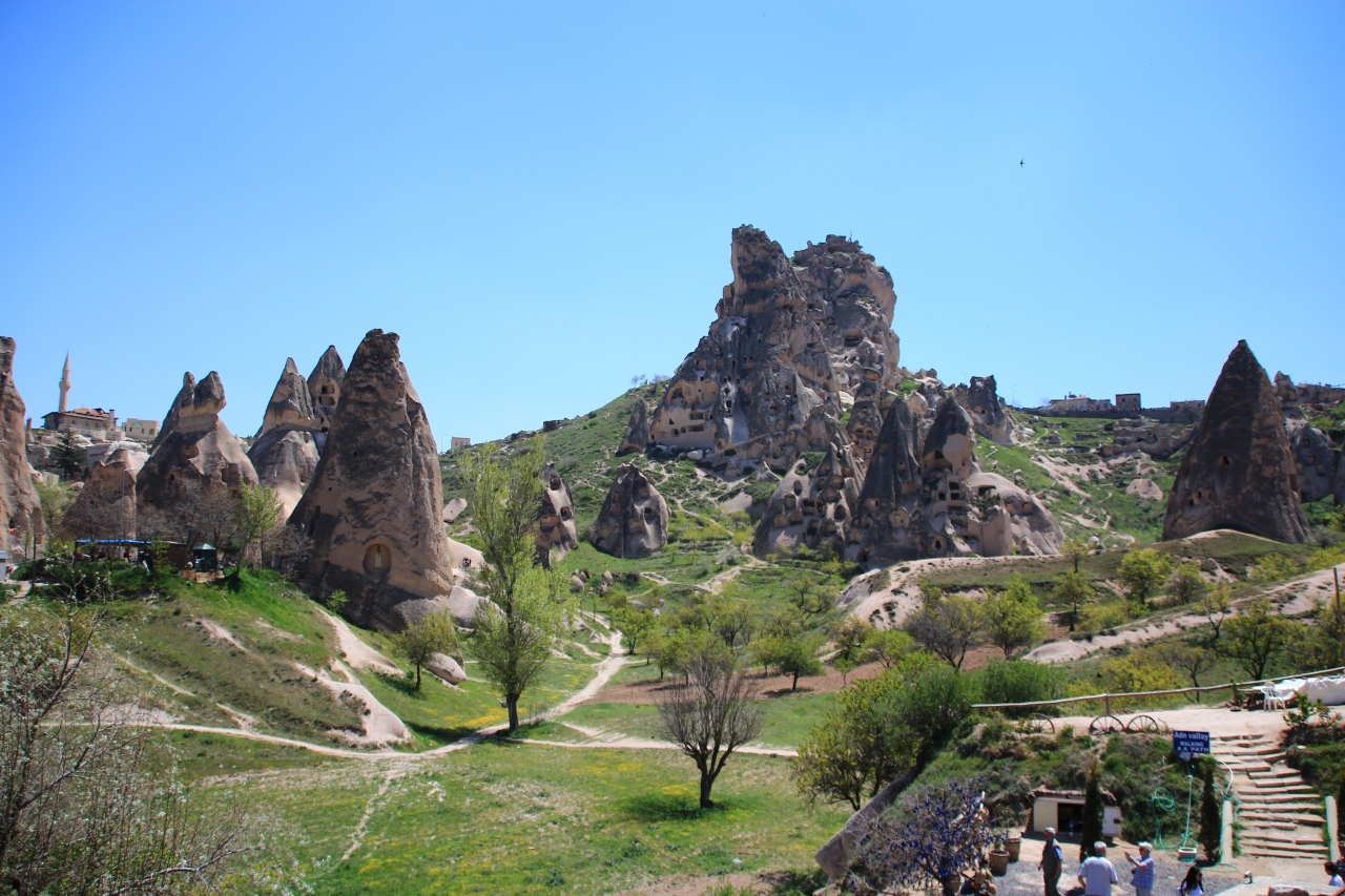 ここは岩山と、その周りにある洞窟住宅が面白い景観をなしています。一際目立つ岩山には多くの明りとり窓がありますが、昔はここは城塞として使われたそうです。と言っても、このあたりはかなり脆い砂岩なので、現在は内部には立ち入りできないとも聞きました。
