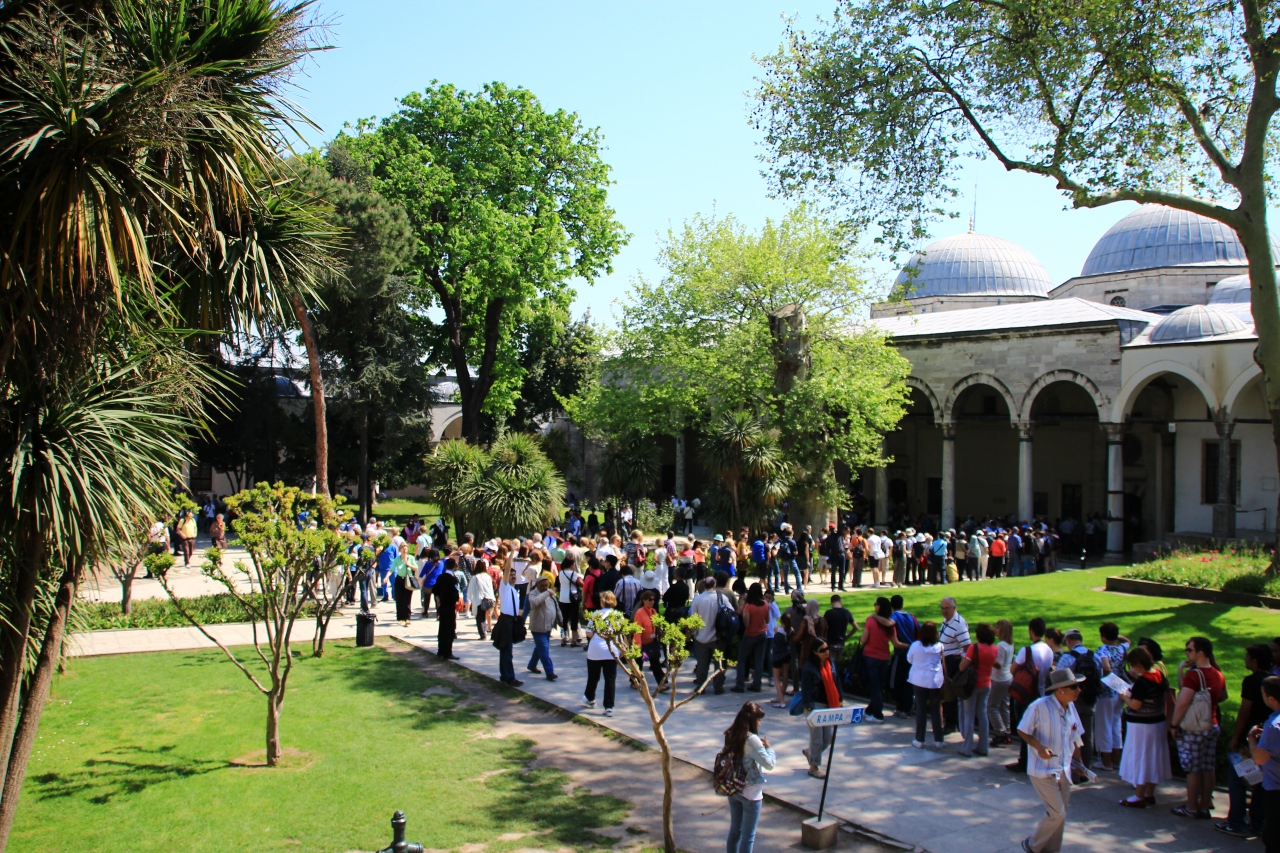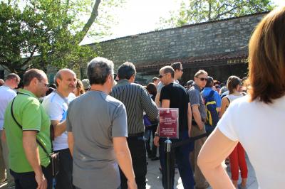 イスタンブール観光で、トプカプ宮殿は混むので早い時間帯に行っておいたほうが良いと言われていたので、ほぼ開場と同時に行きました。それでもチケットの売り場で約30分、ハレムの観光で30分程度かかっているうちに、内部は大混雑になってしまい、人気の宝物館はすごい並びでとても入れないという状況になりました。