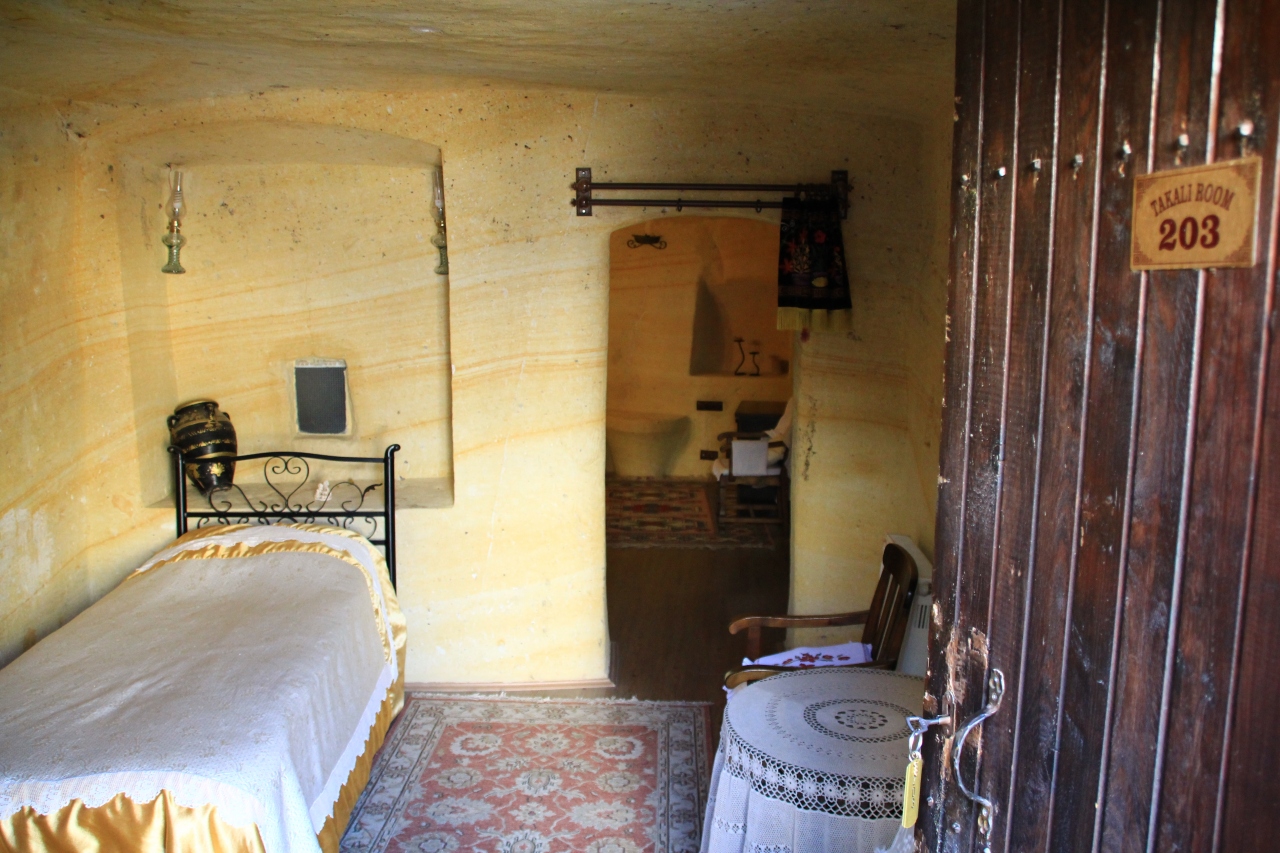 一応洞窟ホテルとは銘打っていますが、普通にガイドブックに乗っているような感じの作りではなくて、岩壁に掘られた半洞窟の民家といった感じです。部屋は一般の部屋が4部屋、スイートが2部屋で、もちろん一般の部屋に泊まりましたが、設備はさすがに最低限という感じでした。