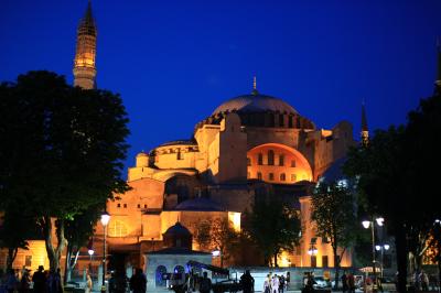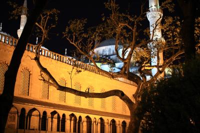 イスタンブールの観光ですが、月曜日だったので、残念ながらアヤソフィア美術館は閉館でした。しかし、公園から見ると左右にアヤソフィアとブルーモスク。赤い古びた作りのアヤソフィアと現役のモスクらしく白く美しく輝くブルーモスク、その対照的な姿がどちらも美しく、特に夜のライトアップされた姿は美しかったです。