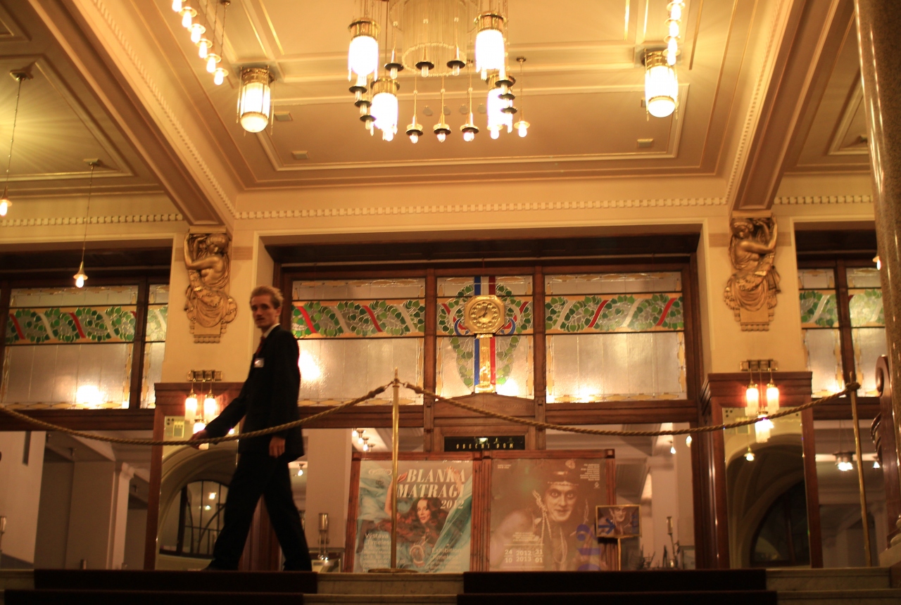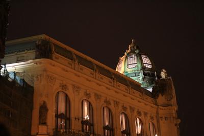 旧市街広場からほど近い場所にある市民会館ですが、ミュシャの壁画があり、内部もアールヌーボー調の建築で美しい。また、カフェやレストランも併設されているということで、夕食がてら訪れてみました。しかし、残念ながら目的の壁画のある正面は工事中で、ファサードがかけられており、全く見れませんでした。(おかげで、当初この建物で良いか確信が持てませんでした。)