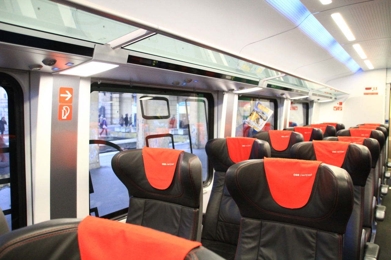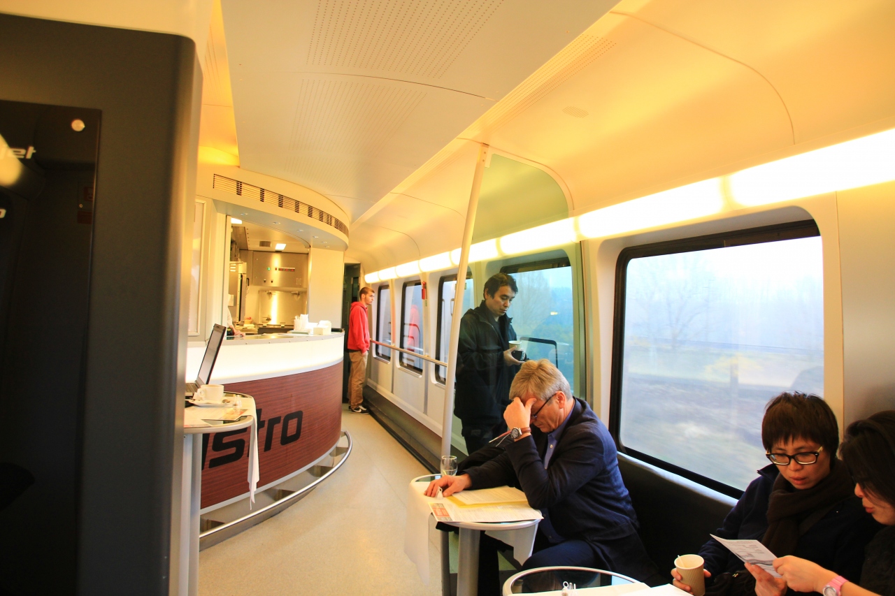 自分が乗ったのは一等車でしたが、駅にも一等客用のラウンジがある等、日本に比べてグレード差は大きくとってあるような気がします。といっても、イタリアでも特急の一等車に乗りましたが、乗り心地は新幹線のほうが良いような気がします。また、座席が固定なので、知らない人と向かい合って、足に気をつけなければならないというのも一等車ではどうかなという気がします。