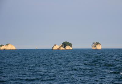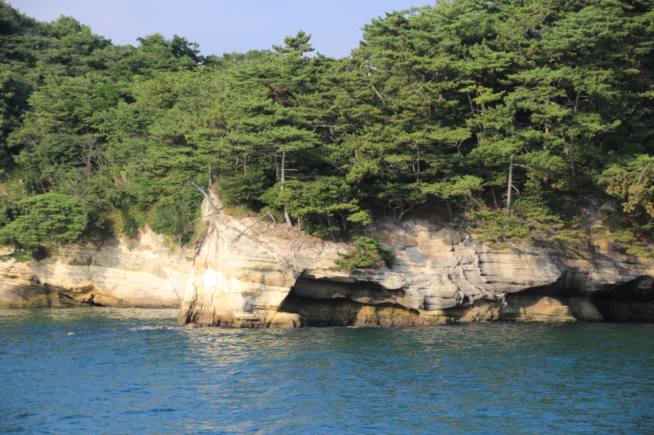 湾の中は比較的平坦で海沿いまで緑が茂る島も多いですが、奥(太平洋より)まで行くと、波の浸食のせいか、頂上部にぽつんと松が2~3本生えているだけというような、いかにも松島という光景を見ることができます。