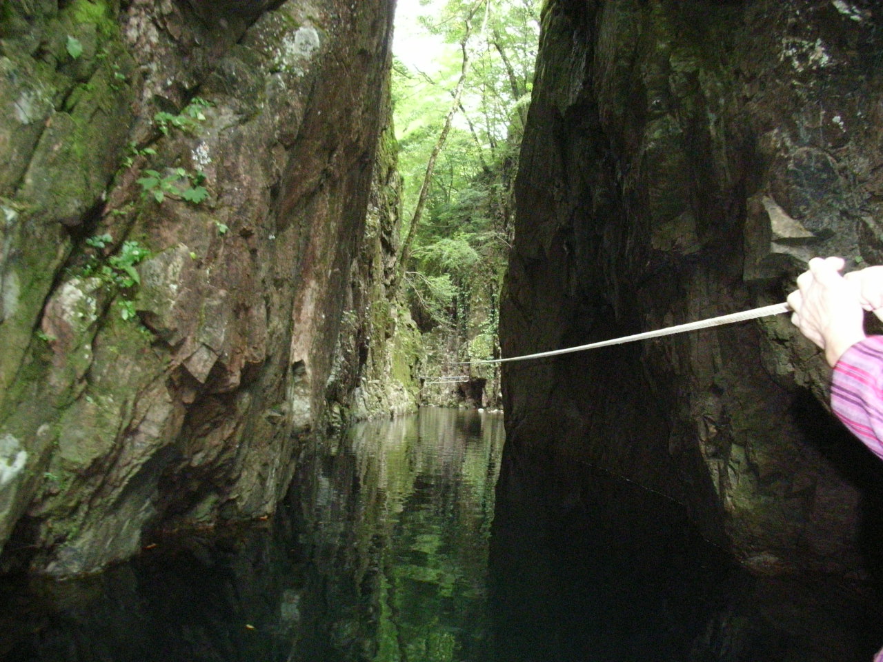 三段峡の遊歩道でも一番奥にあるといっても良い見どころスポットです。その名前の由来は、ちょうど猿が飛び越えて行けるくらいの極端に狭くなっている高い沢の下を通っていくところにあります。アクセスは崖にそってワイヤーがはってあり、それを手繰って渡船で進んでいきます。少し進むと開けた場所に出て、二段滝があり、そこで写真休憩です。5分ほど休むと再び戻るだけですが、沢の水はきれいで、なかなか涼しげな場所であります。