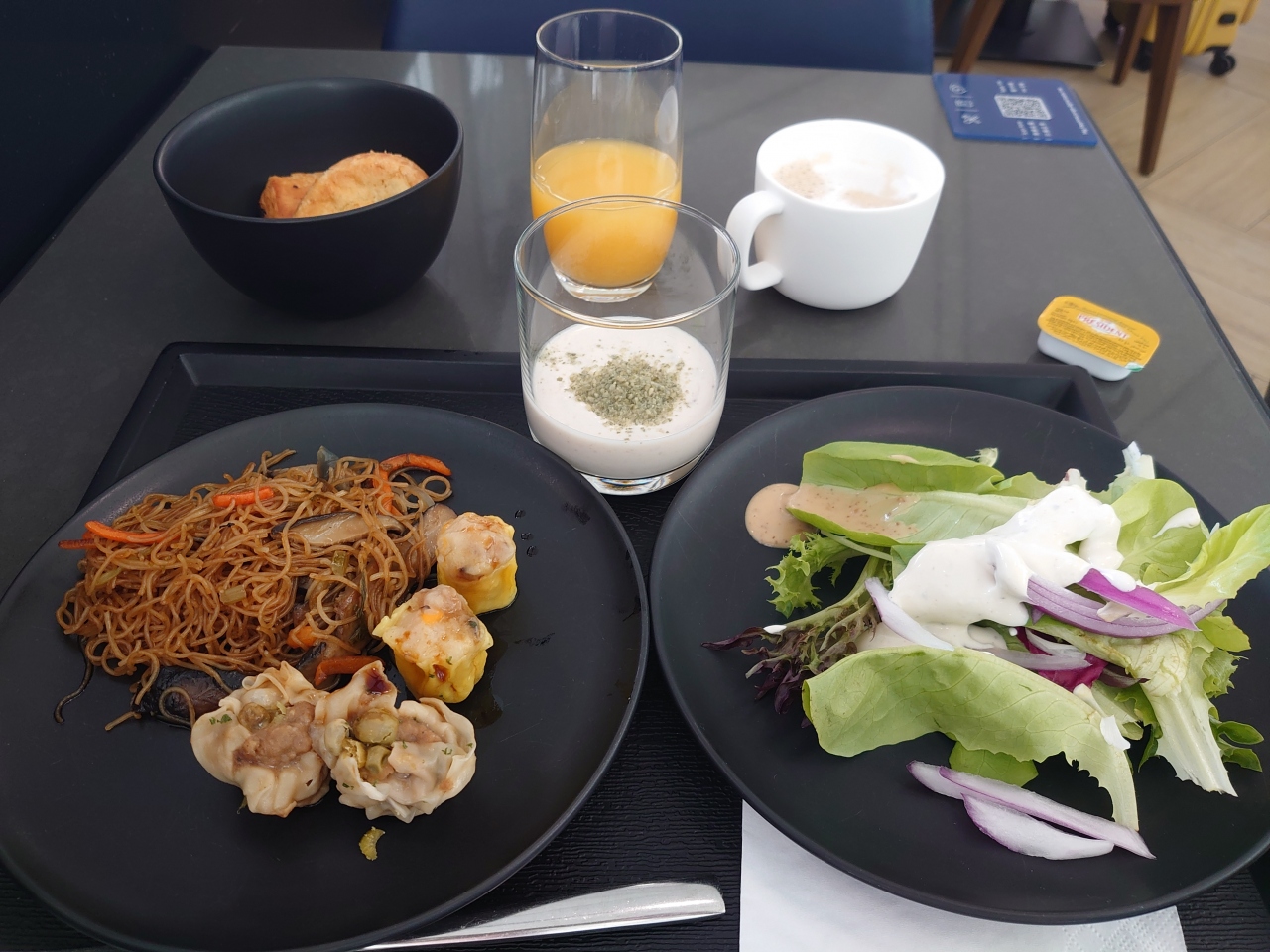 東京からバンコクへの乗り継ぎ時に利用。朝日が差し込むラウンジ内はさわやかな朝食をとるのにぴったりでとても優雅な気分でいられた。早朝なためか利用客もまばら。