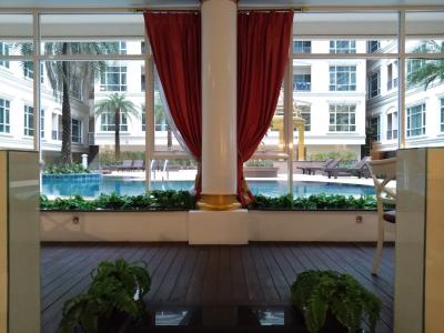 朝食はガラス越しに中庭にあるプールが見える場所でいただいた。種類も豊富でテーブルも数多くあるのでゆったり食べられる。