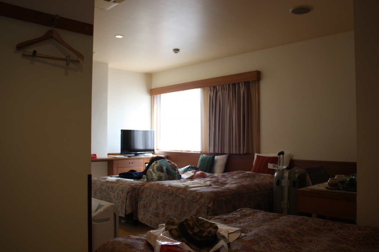 部屋は3ベッド&ソファもあり十分な広さ。空の冷蔵庫、ゆかた、スリッパなど一通りそろっている。子供用のゆかたは内線で頼めば部屋まで持ってきてくれた。