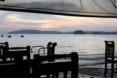 せっかく海に来たのでシーフードをと思い、日暮れ時散歩の帰りに食事。すでにビーチ側の席は埋まっていたので店の真ん中辺に座る。雰囲気は文句なし。この日は雲が多かったが夕日はかろうじて見えた。