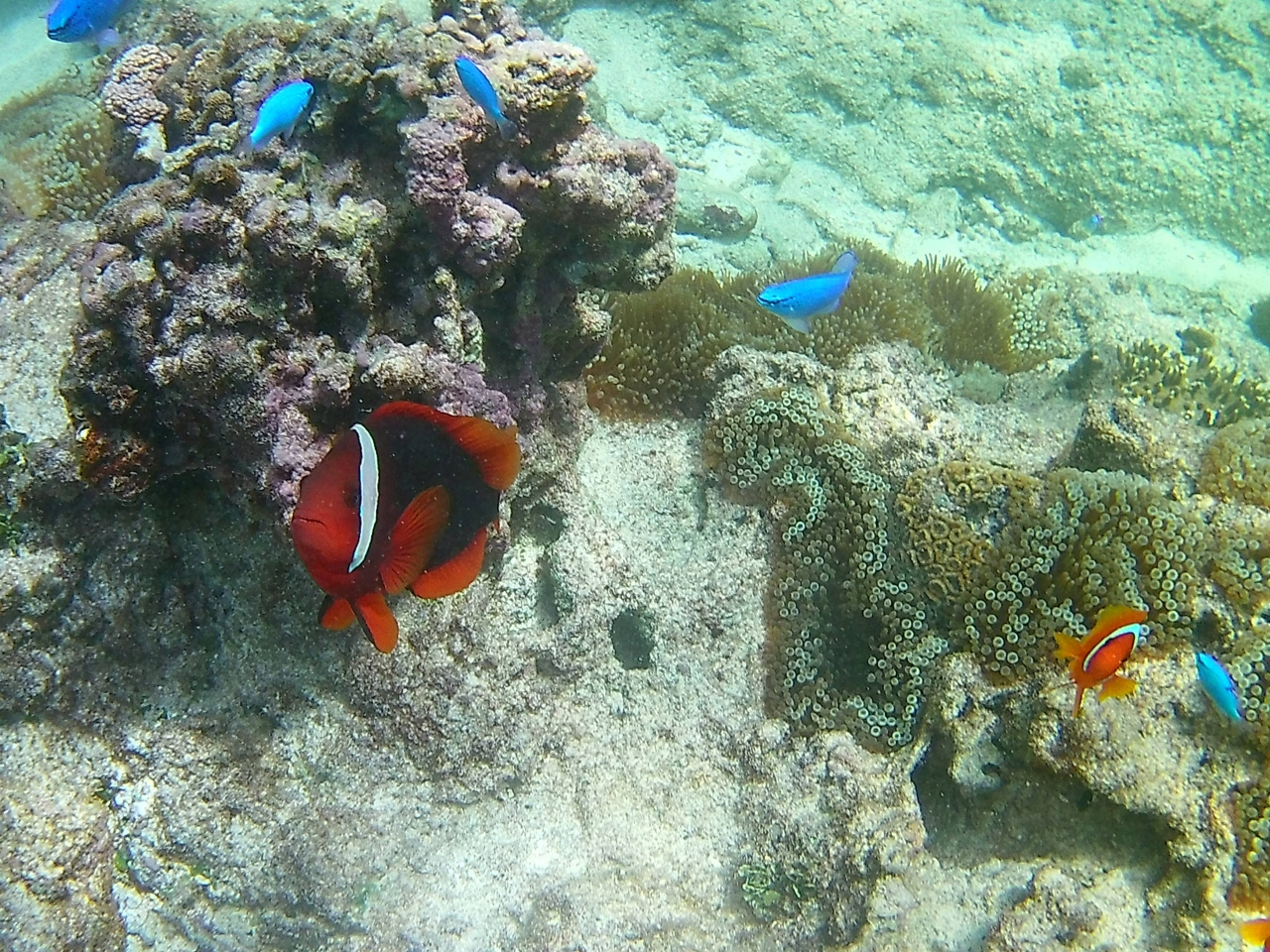 水質はかなり透明できれい。昔に比べたら魚も少なくなっているとのことだが、初めて行く方には問題なく楽しめる。正面の大きな岩の周辺がスポットとのことで確かに熱帯魚が多く見られた。監視員(おそらくショップの人)がサンゴの上などに留まっている利用客を注意喚起している。- 旅行時期