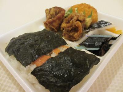 おかずは大きな唐揚げ2個と、コロッケ、ちくわの磯辺揚げなど。