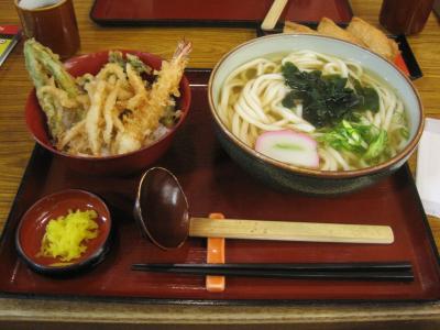 普通のうどんに、春らしく白魚・菜の花・アスパラ・海老がのった天丼がセットでした。