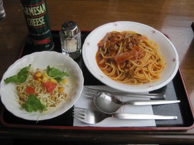 自分が食べたベーコンとナスのスパゲティセットはサラダ付きで、