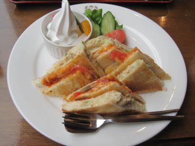 嫁が食べたトーストサンドウィッチセットはミニソフトクリーム付きで、