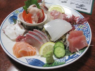 小鉢×2、焼き魚、フライドポテト、鳥の唐揚げ、刺身、焼きおにぎり、ホタテの何だっけ?