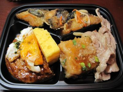 その中から月見ハンバーグ、卵焼き、揚げ出し豆腐、豚肉の炒め物、鯖の南蛮漬けを容器に詰めて買いました。- 旅行時期