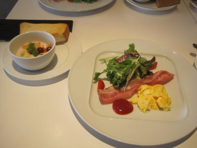 半切れトースト、スクランブルエッグ、ベーコン、サラダ、ヨーグルト、コーヒーor紅茶