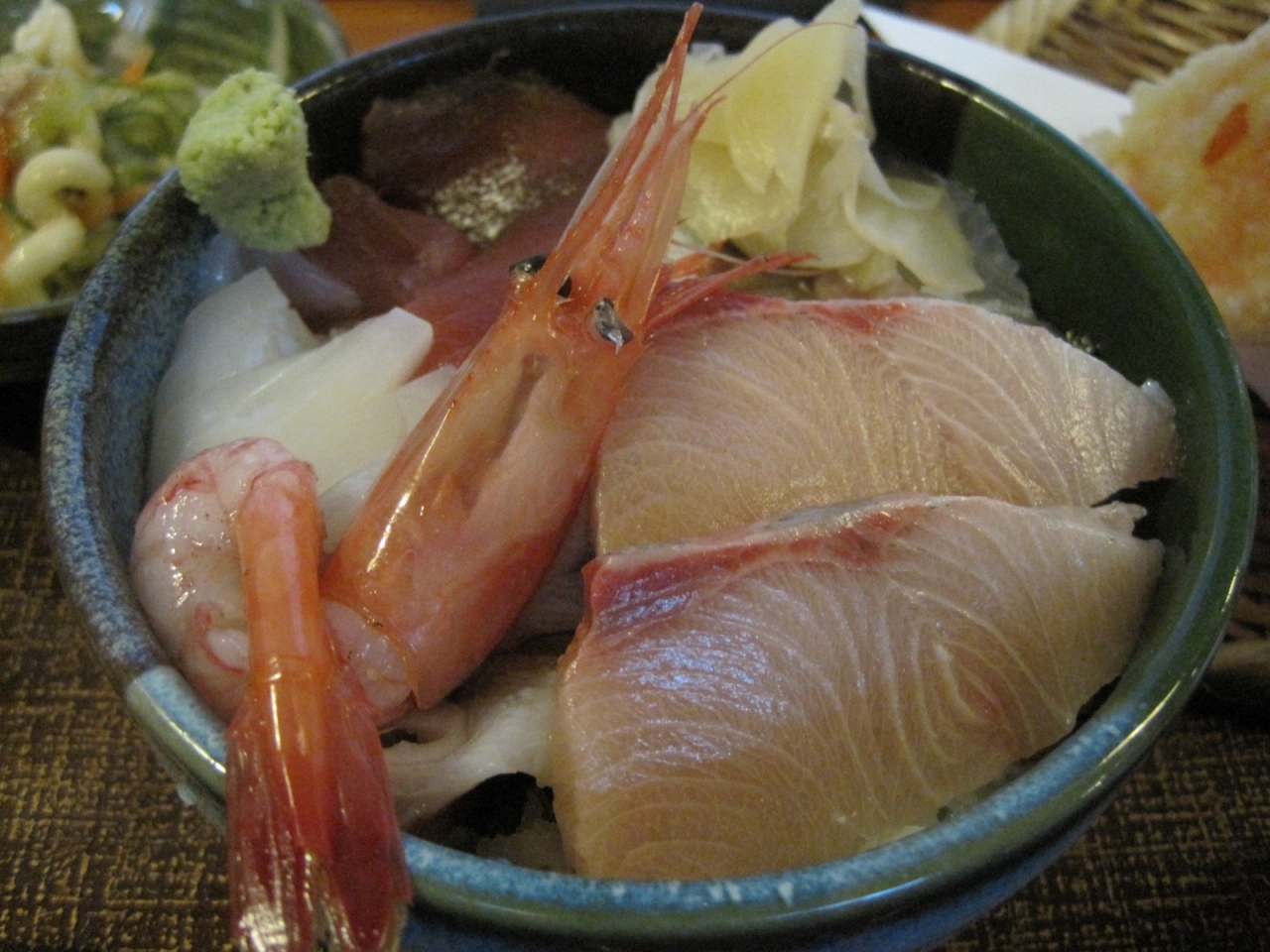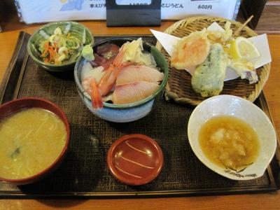 写真のようにミニ海鮮丼、野菜天ぷら、味噌汁、小鉢がついて980円です。