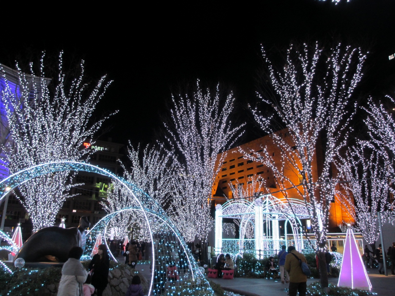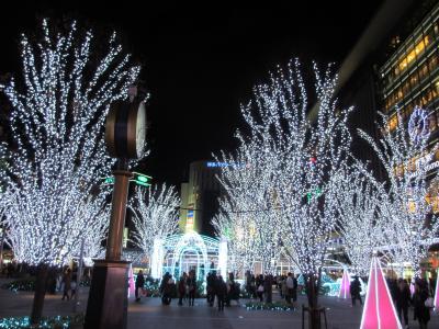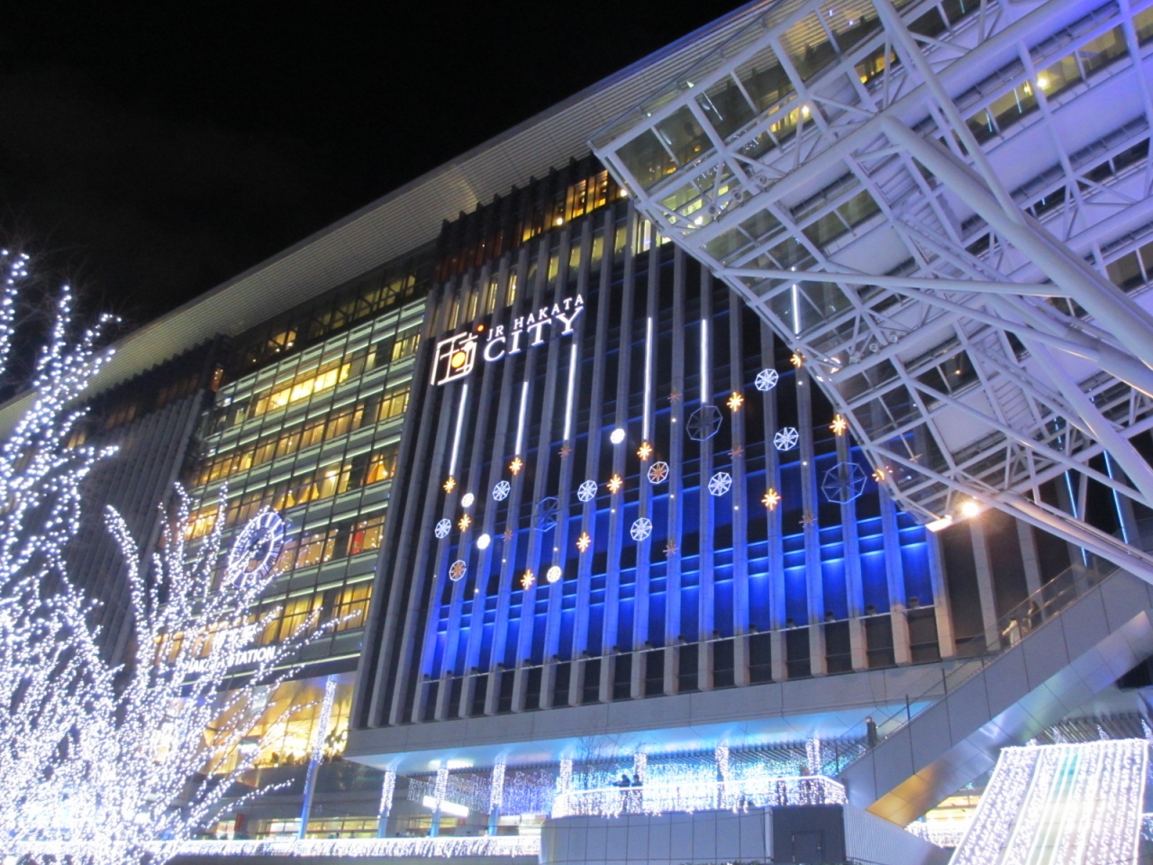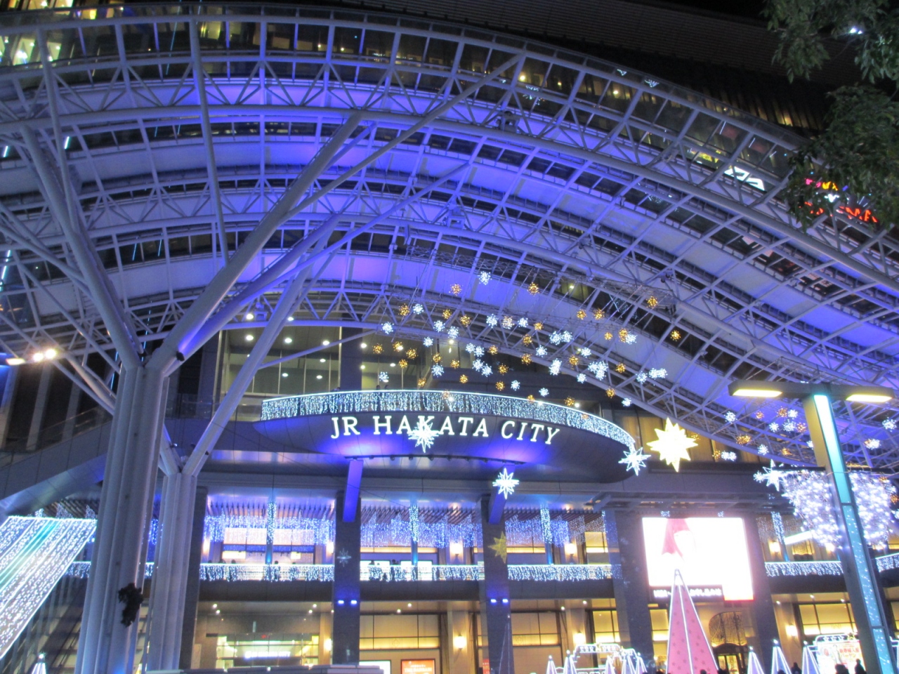 JR博多駅前の広場に飾られたイルミネーションはとても良いですよ。特に感心したのが木々の枝先までライトが丁寧に取り付けていること。このおかげで夜は光の木のように鮮やかに見えます。観光客や地元の人など多くのお客さんが写真を撮っていました。